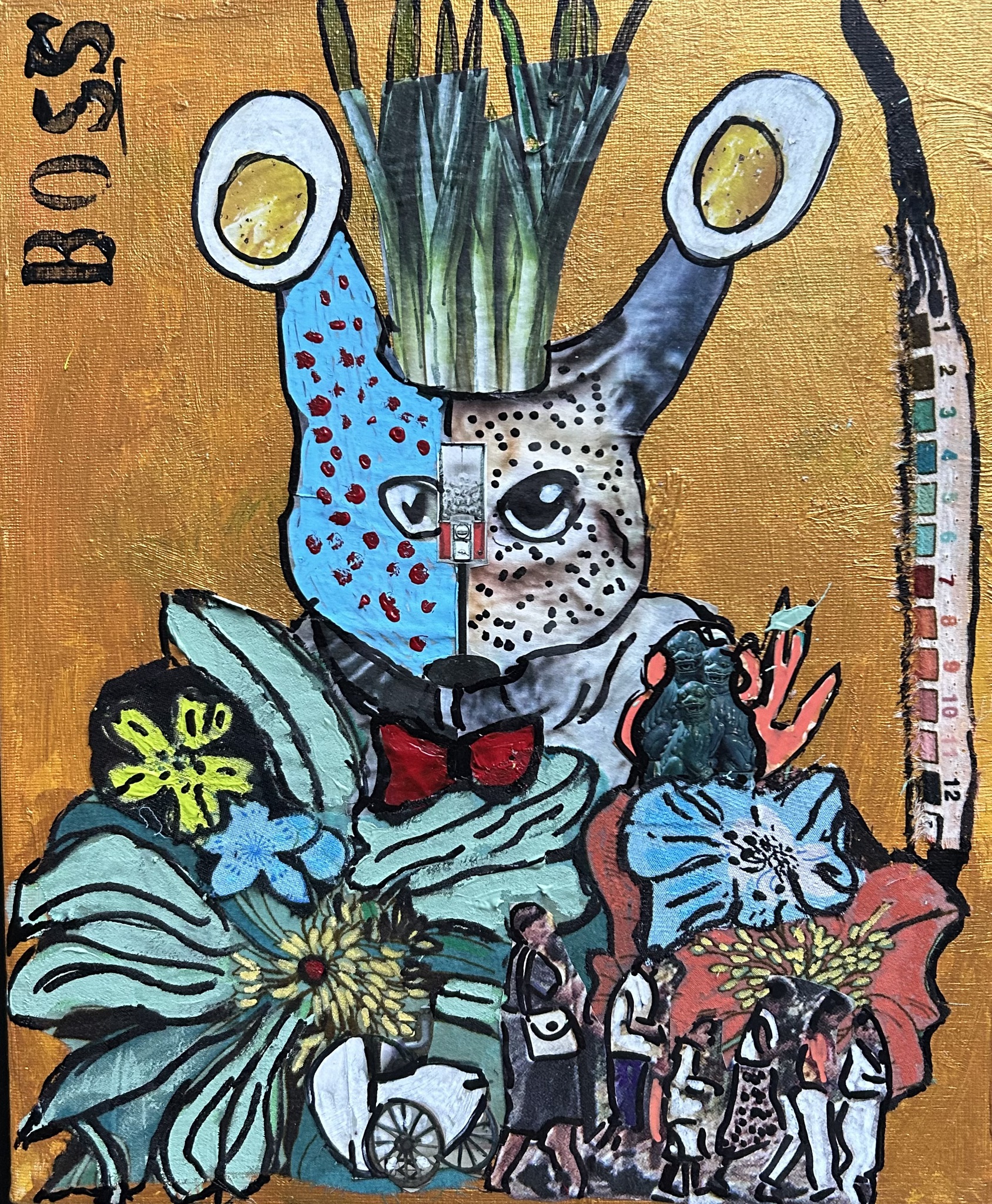 Hij is de baas, en hij wil het weten ook. Collage op canvas