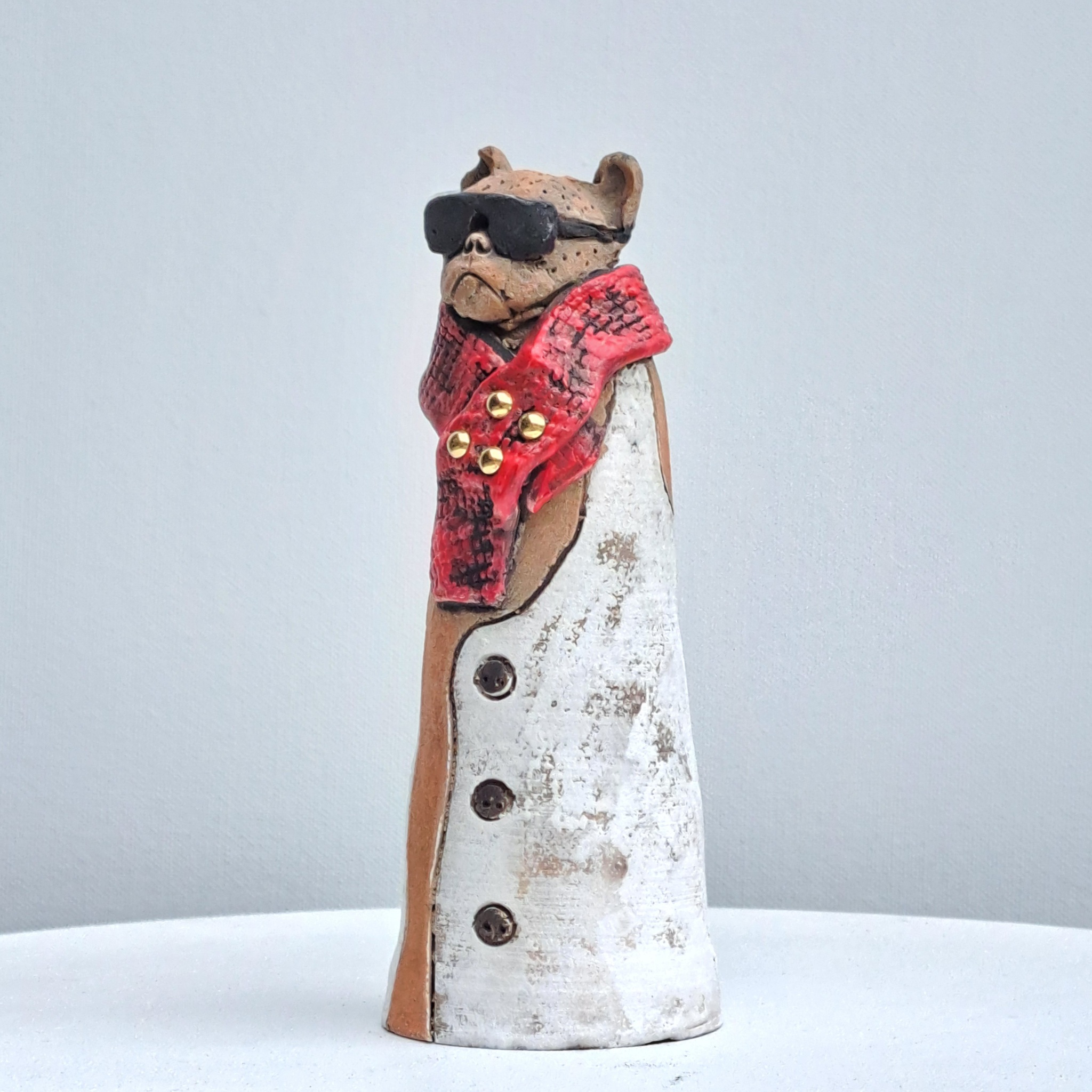 Keramiek sculptuur van een stoere hond . Hij draagt een donkere zonnebril, een witte jas en een rode sjaal, Op de rode sjaal zijn koperen elementen verwerkt. Een combinatie van gedraaide onderdelen met geboetseerde elementen. Mjn beelden zijn niet realistisch maar laten de connectie zien tussen een mens en dier. Gemaakt met vakmanschap, passie en humor. Hoog 15 cm. Geboetseerd en gekleurd met oxides en engobes, Driemaal gebakken in een elektrische keramiekoven op 1045 graden. Op aanvraag meerdere foto's of video beschikbaar