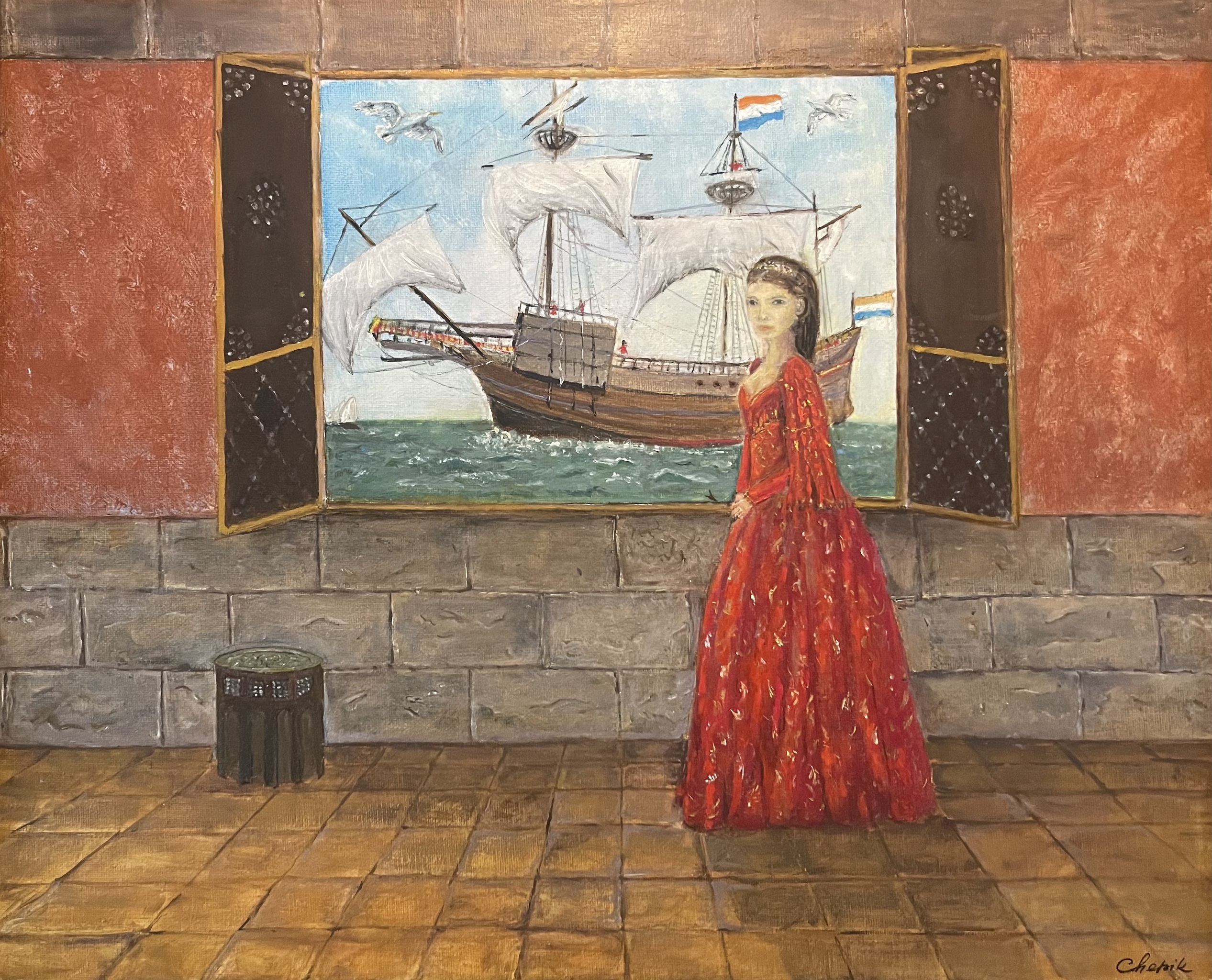 Voor de historische streekroman 'Onderwaterjurk' van Fred Sanders haar partner, schilderde Irina Chepik de vrouw in de hoofrol in de jurk zoals deze op Texel in het Kaap Skil museum getoond wordt