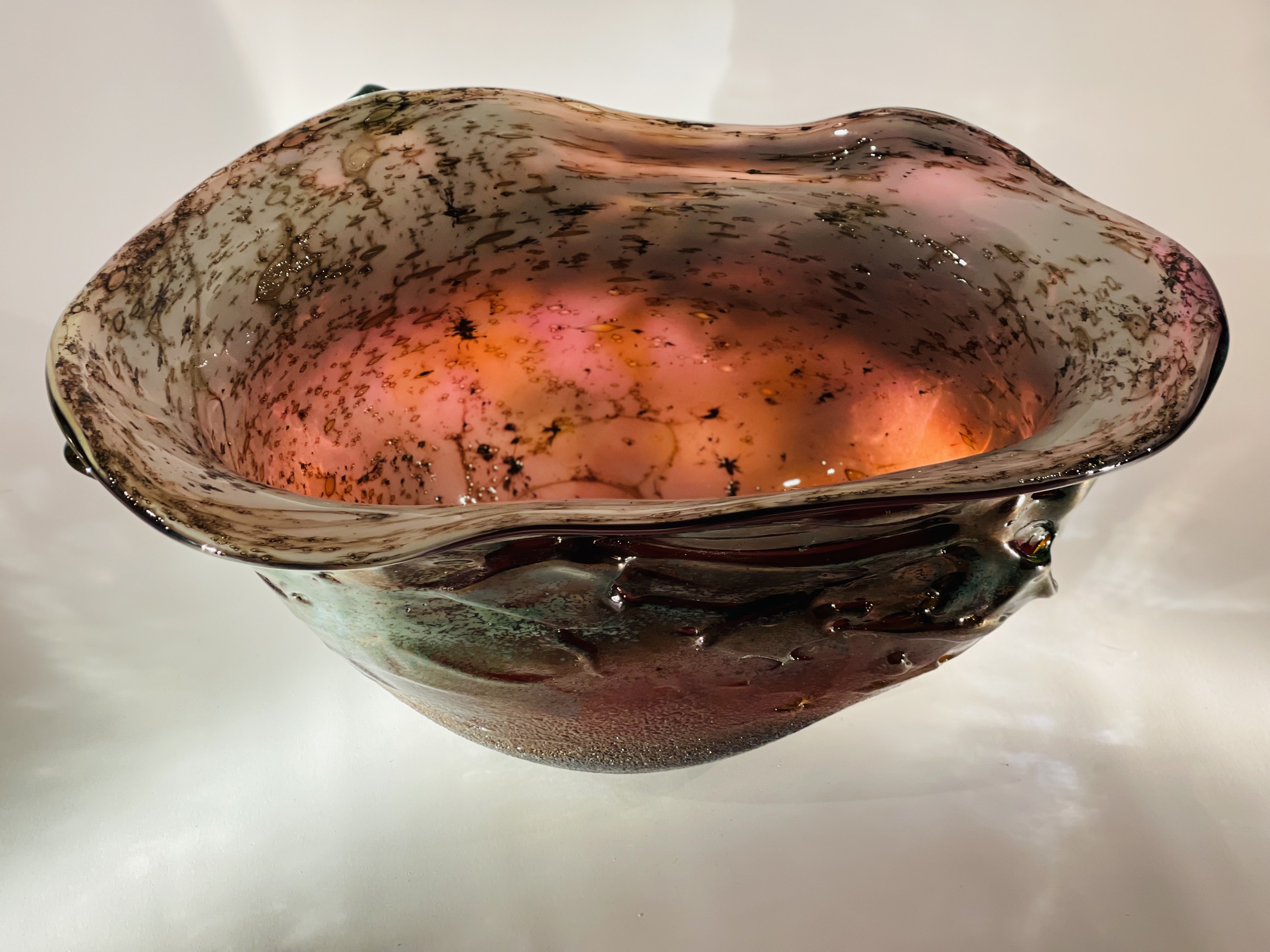 Geblazen glazen schaal met kleurpoeders en koper, gebaseerd op een oesterschelp van binnen glad, van buiten ruw.