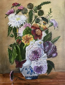 Bloemen werden in de vaas geschikt, gewijzigd in combinatie met de lichtinval en al gauw stonden de lijnen op het doek, met dit resultaat.