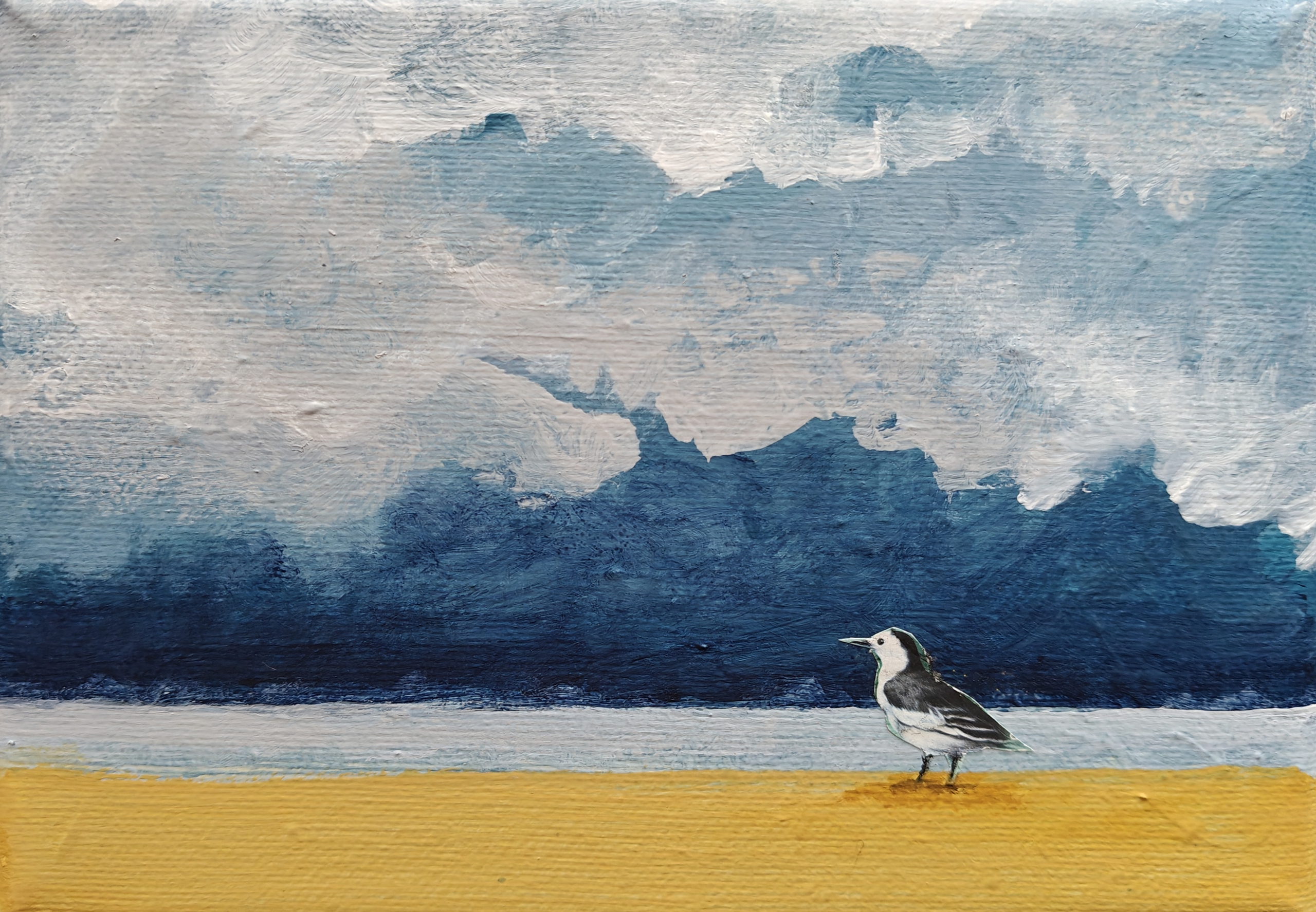 Een klein werkje met een vogel uit een postegel gesneden als collage.