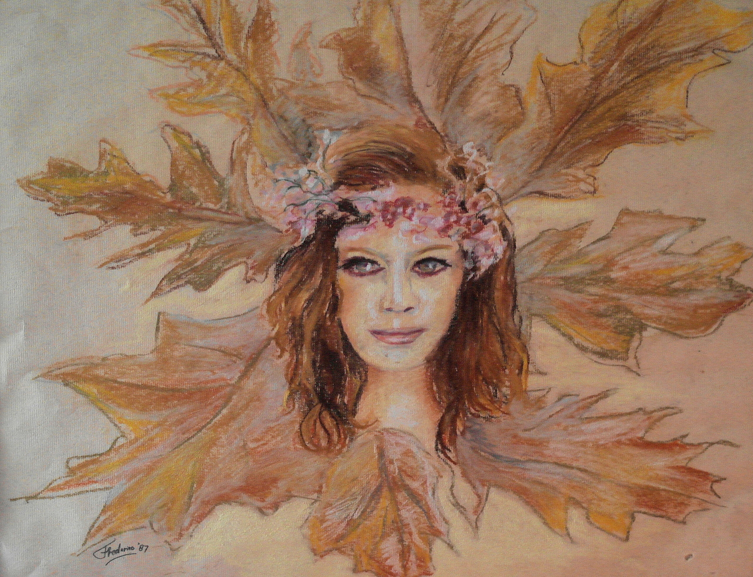 Herfstmodel Herfstnimf Vrouwportret Herfstkunst Natuurinspiratie Warme_tinten Romantisch_schilderij Bladeren Seizoenskunst Pastelkleuren