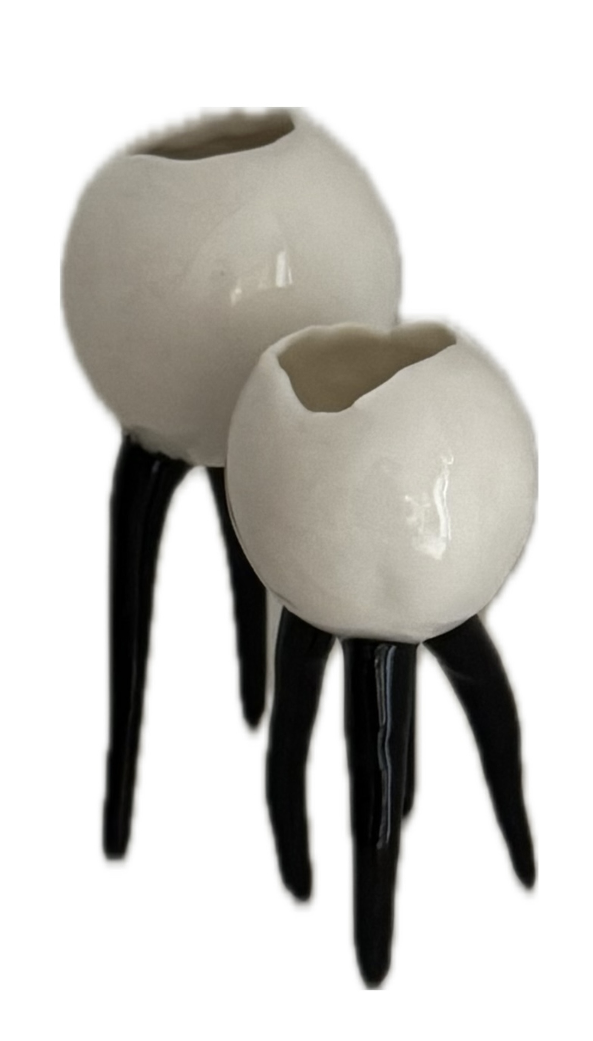 Deze objectjes zijn van porselein en zwarte klei gemaakt. En na de biscuitbak transparant geglazuurd en steengoed gebakken. De grootste is 5 bij 12, de kleinere 10 bij 4.
