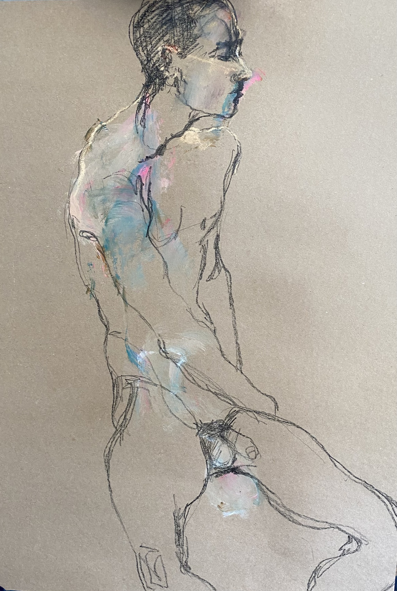 Ake mannelijk naakt, gemengde techniek op bruin kraftpapier.