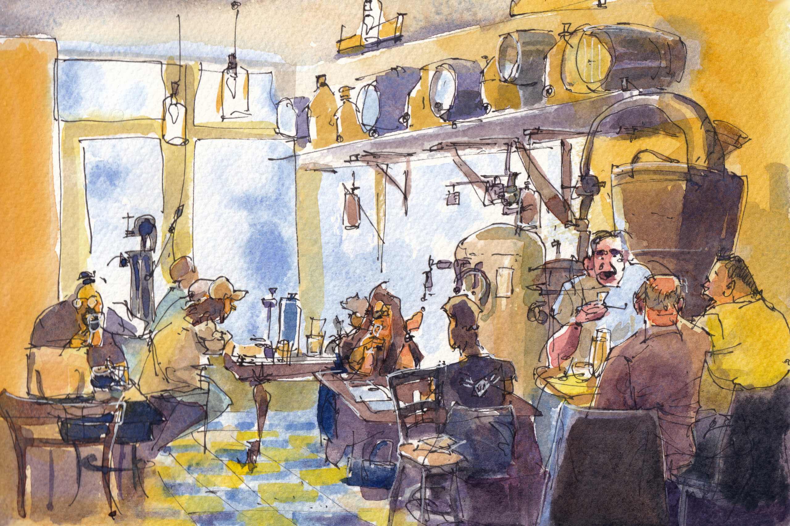 Een proeverij in de destilleerderij Van Kleef te Den Haag. Gezelligheid tussen de houten vaten, destilleerkolommen en mede‑drinkers.