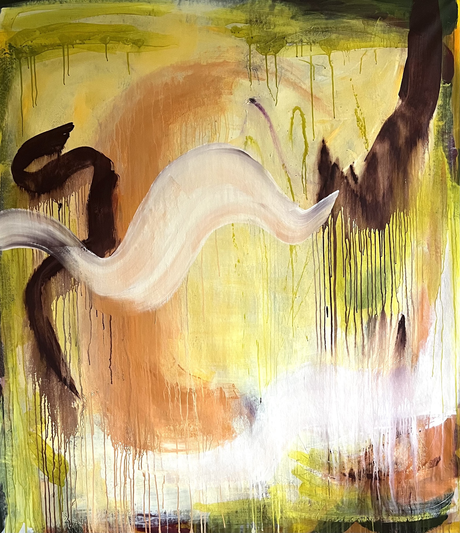 Dit werk kent vele lagen, het is als een heerlijke melodie die je meeneemt naar een plek waar het veilig is en mysterieus mooi. Het is geschilderd op onbespannen canvas, maar ik kan het natuurlijk laten opspannen als dat gewenst is.