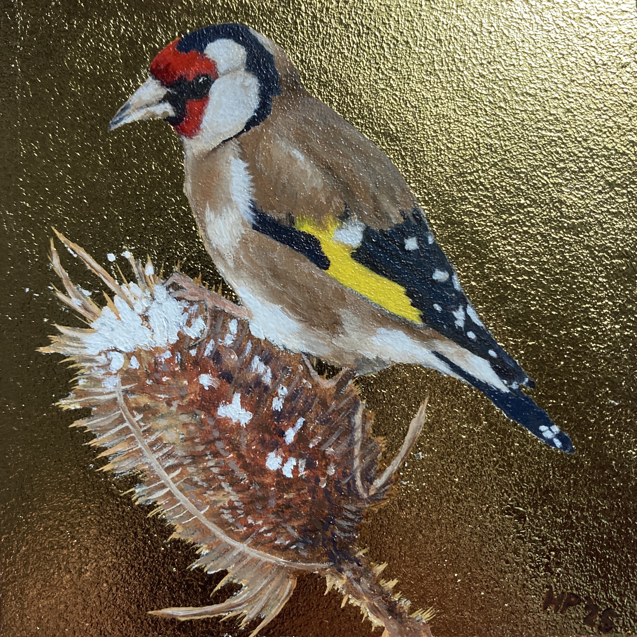 Miniatuurschilderij, olieverf en slagmetaal op Masonite