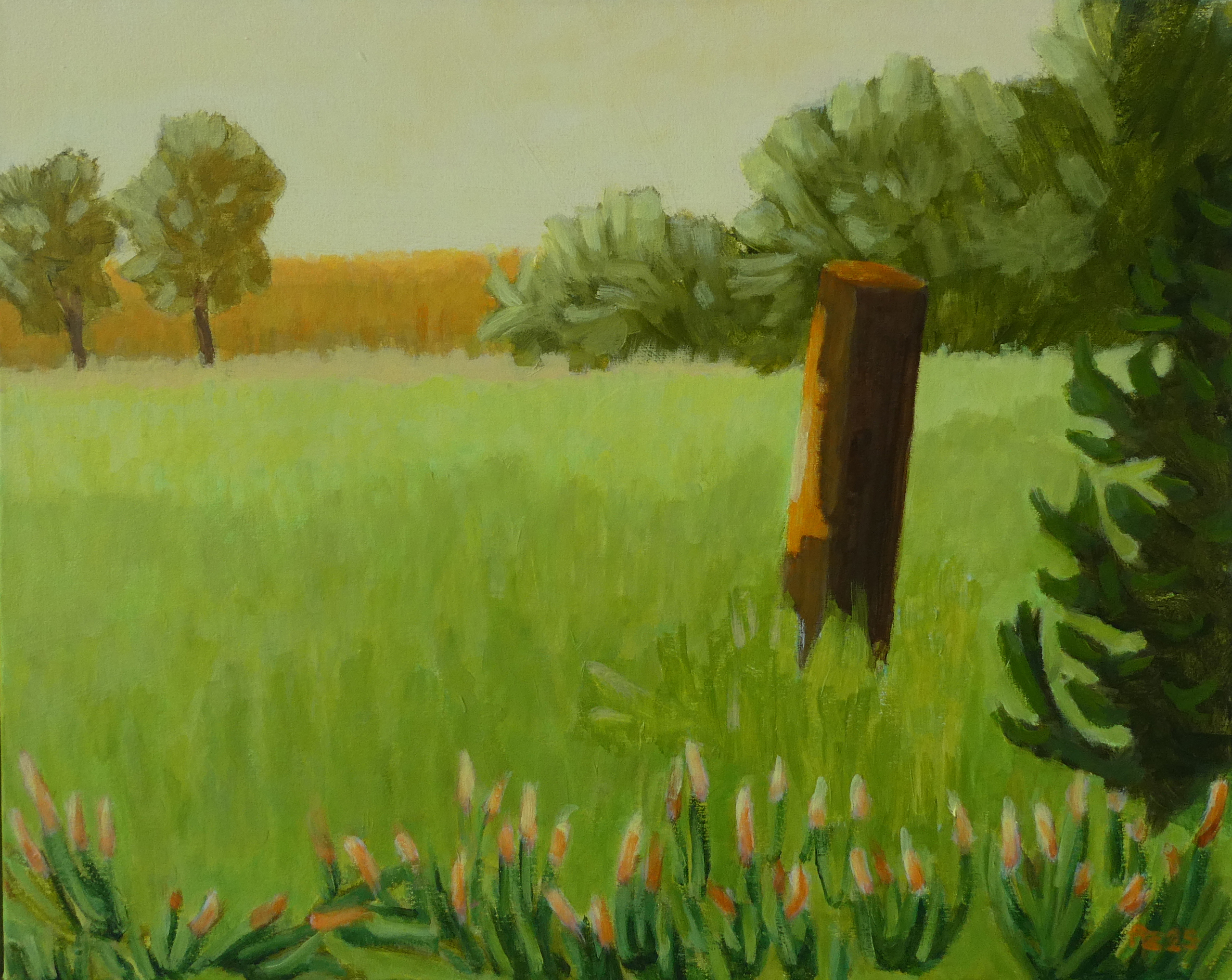 De maís is rijp, de bomen nog groen. De zon staat heel laag vandaag en verlicht de toppen van de maïs. Wat een genoegen om hier in de wei te zitten en de eerste wintergasten te horen. Zijn het de roodborsten? Het is een feest voor het oog, al die gelen en groenen.