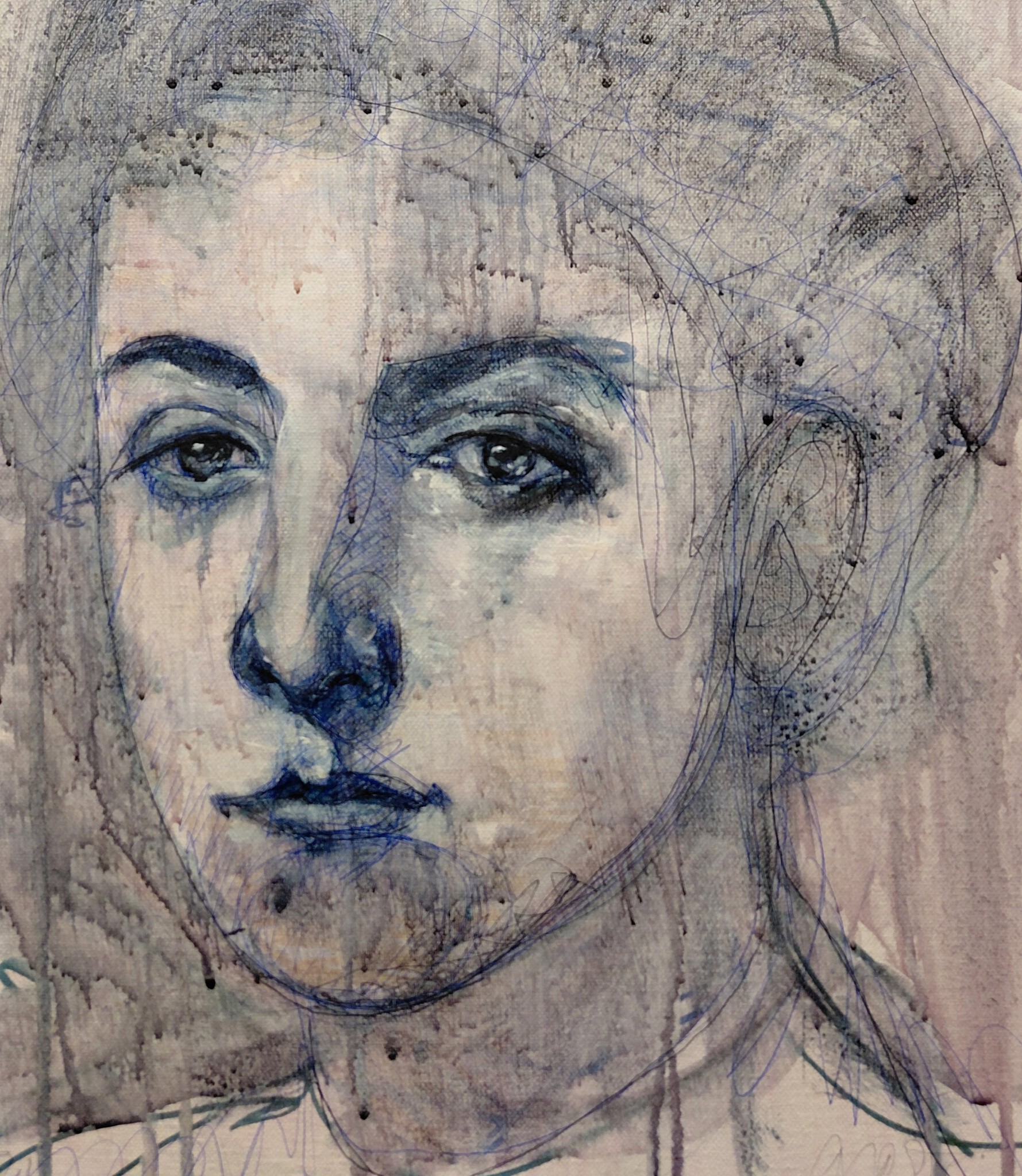 Dit kunstwerk is een expressief portret in zachte grijs-blauwe tinten. De losse lijnen en vlekkerige verf geven het een dromerige, melancholische sfeer. De nadruk ligt op de peinzende ogen, terwijl het gezicht deels vervaagt, wat een gevoel van kwetsbaarheid en introspectie oproept.