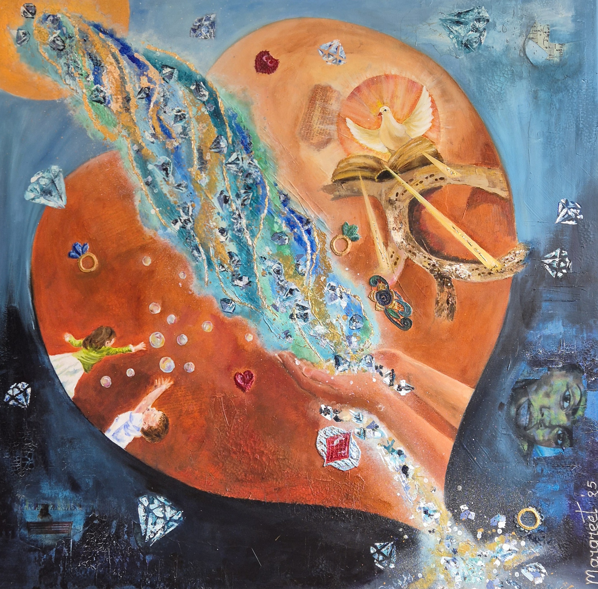 Dit schilderij geeft een aantal overdenkingen van mij weer die ik in mijn hart bewaar. In een blog kunt u erover lezen.