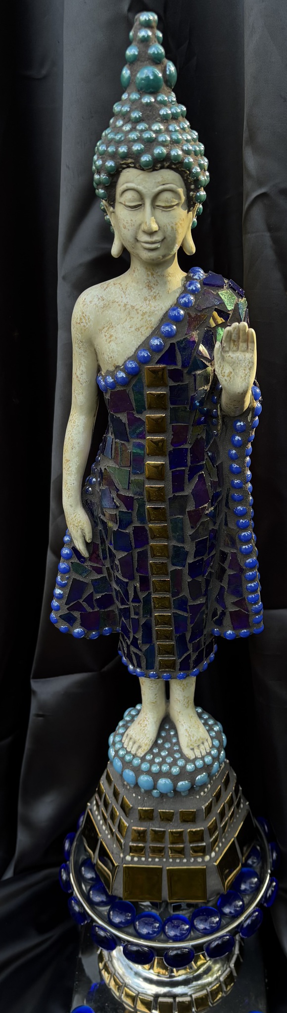 Boeddha op zuil bewerkt met glas en keramische tegels. Boeddha van steen en zuil van keramiek.