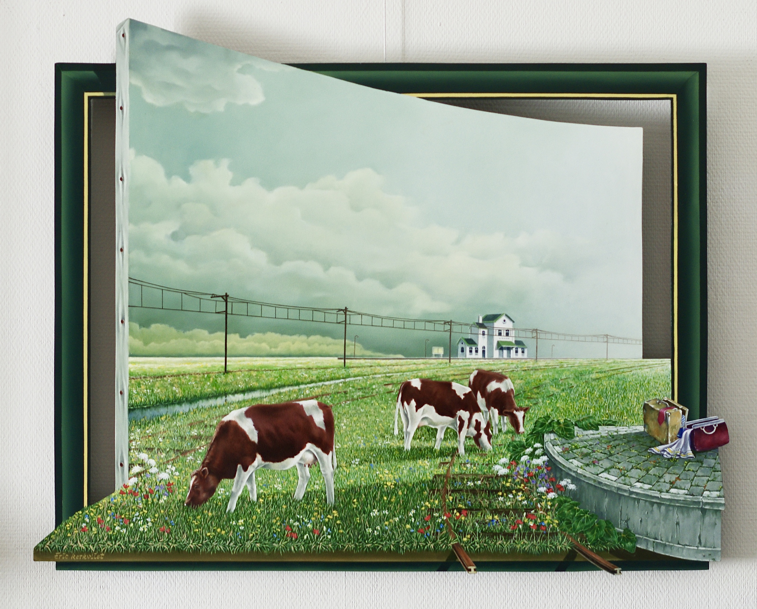 Eric Kerkvliet schildert met olieverf uiterst gedetailleerd voorstellingen op iets verhoogd paneel waardoor bij juiste belichting een Trompe-l’oeil-achtig effect ontstaat.