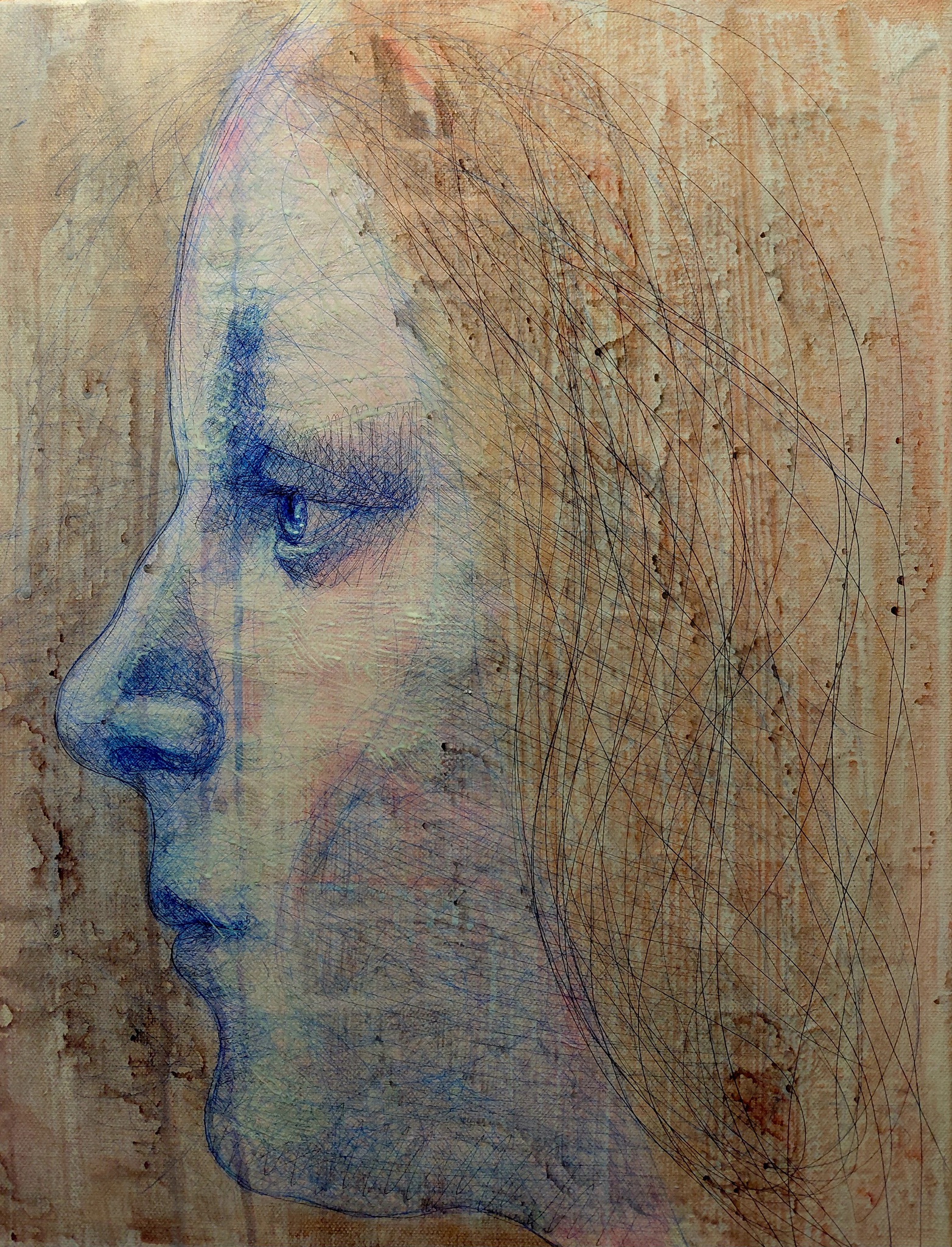 Een dromerig portret in profiel, opgebouwd uit fijne lijnen en zachte tinten. De verweerde achtergrond versterkt het gevoel van tijd en vergankelijkheid. De blik van de figuur straalt rust en introspectie uit. Luchtige haarlijnen suggereren beweging en gedachte.