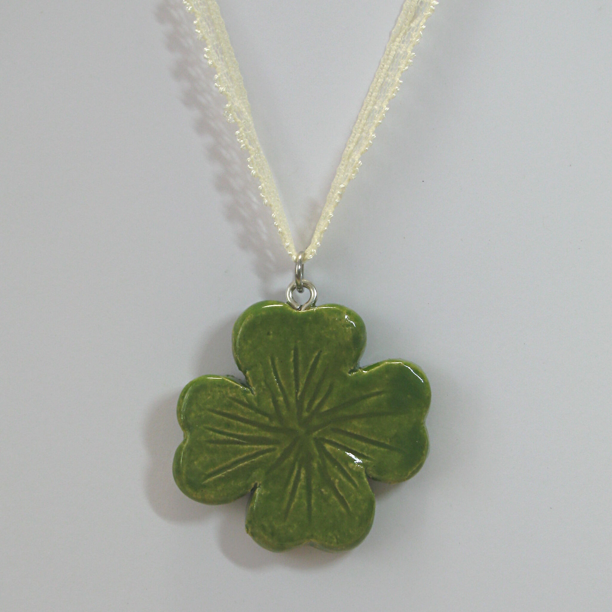 uniek 'collier' van geglazuurde keramieken klaver en een bijpassend kanten lint. opgegeven afmeting van de hanger is bij benadering; de lengte van het koord is ongeveer 60 cm. let op: retourneren kan alleen bij ongebruikt en onbeschadigd