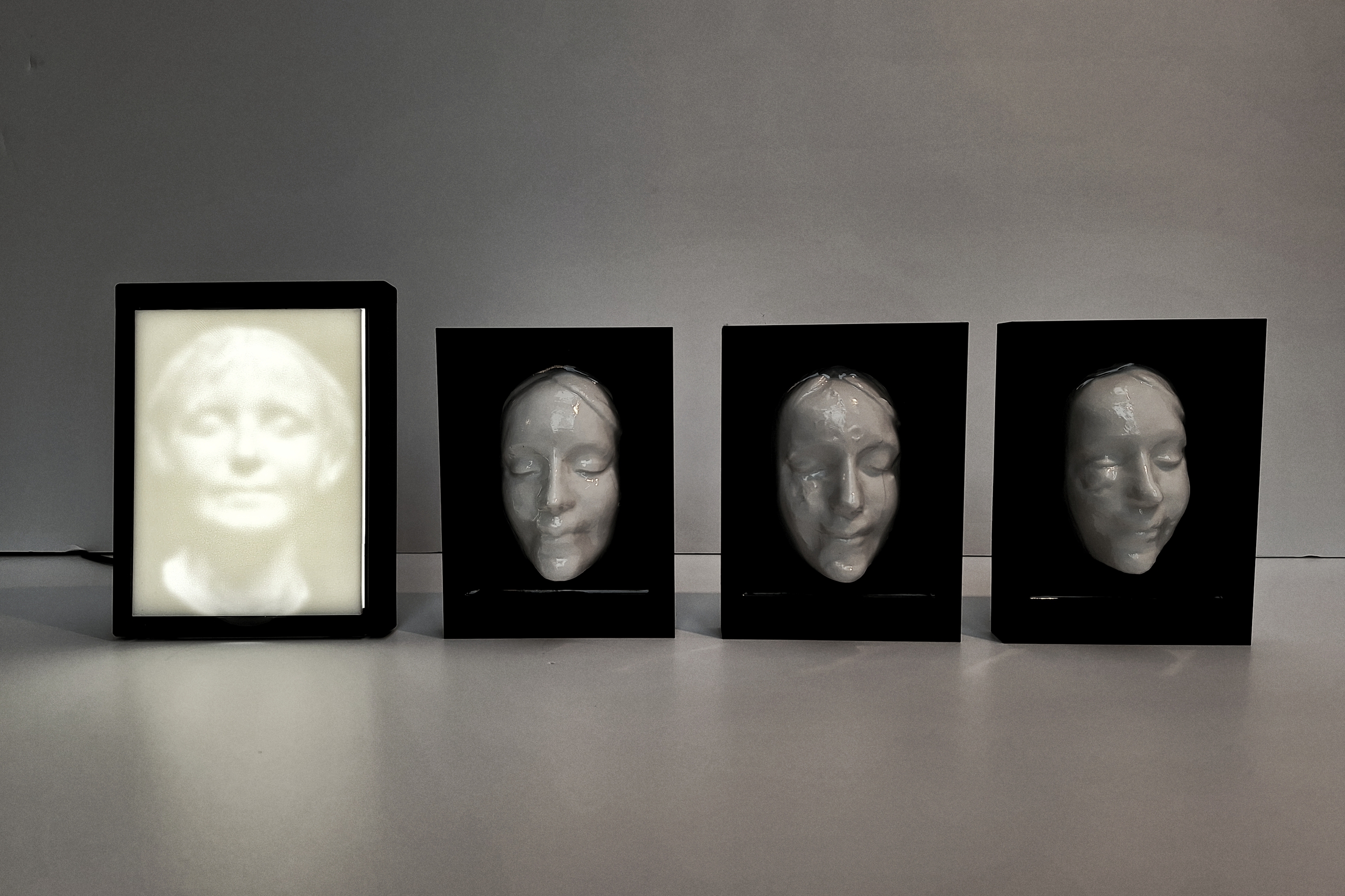 This installation revisits the myth of L’Inconnue de la Seine as an early precursor of what Jean Baudrillard later described as the precession of simulacra: the disappearance of the original beneath an endless chain of reproductions. On the left, a lithophane shows the supposed face of the drowned unknown girl – itself already a reproduction of a questionable death mask. On the right, three 3D-printed masks are generated by AI from increasingly blurred photographs of that image. As each version drifts further away from the source, it paradoxically gains a sense of authenticity, as if a new truth emerges independent of any origin. Just like the legend of L’Inconnue – with no certainty about who she was, nor whether the mask was ever real – images today circulate as signs without reference. Copies give birth to new copies. The original is no longer a starting point, but a rumour. The work reveals how images not only survive but grow stronger as they detach from their source. The simulacrum replaces the real – and we barely notice the loss.