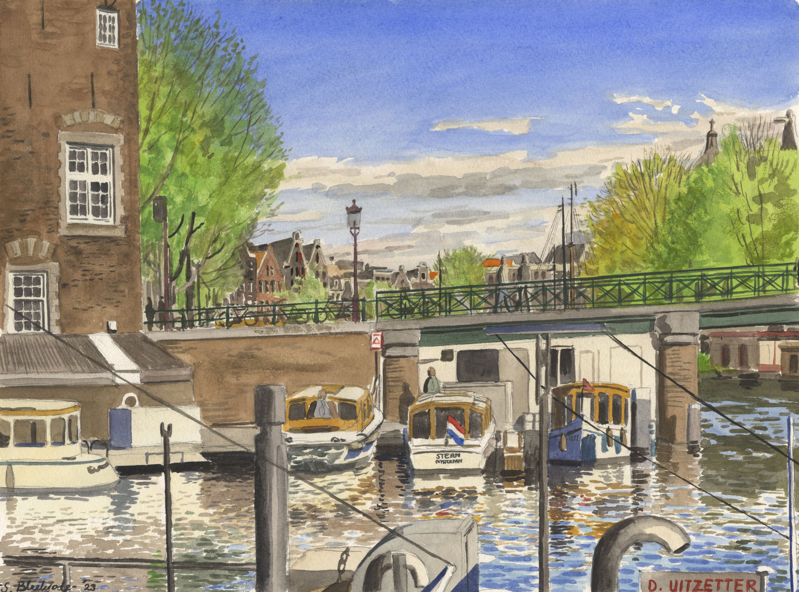 Amsterdam Stad City Gracht Canal Schilderij Painting Watercolour Aquarel Kunst Art Tekening Drawing Groen Green Blauw Blue Lente Spring Zon Sun Licht Light Realisme Realism