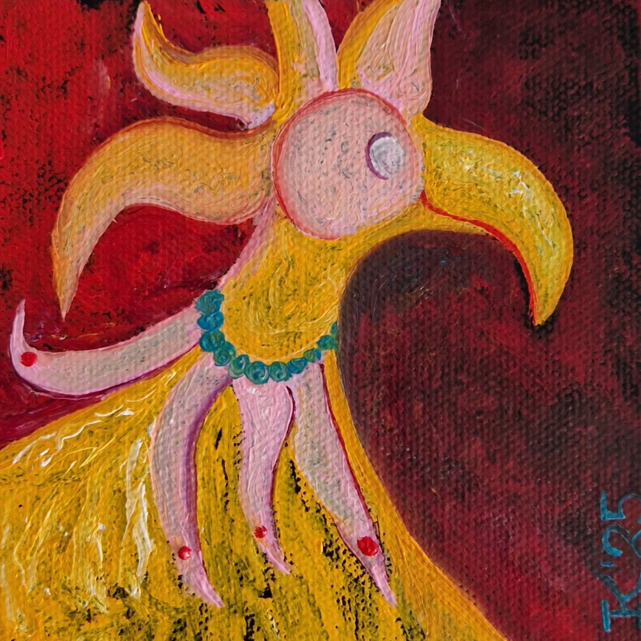 Olieverf op katoen, 10 bij 10 cm. Aan de achterkant zijn twee haakjes bevestigd met daartussen een touwtje, waardoor je het schilderijtje kunt ophangen. Pictoright 2025. De prijs is exclusief verzendkosten. Als je je aanmeldt voor mijn maandelijkse gratis nieuwsbrief - zie links, onder communicatie - ontvang je bij aanschaf 10 % korting.