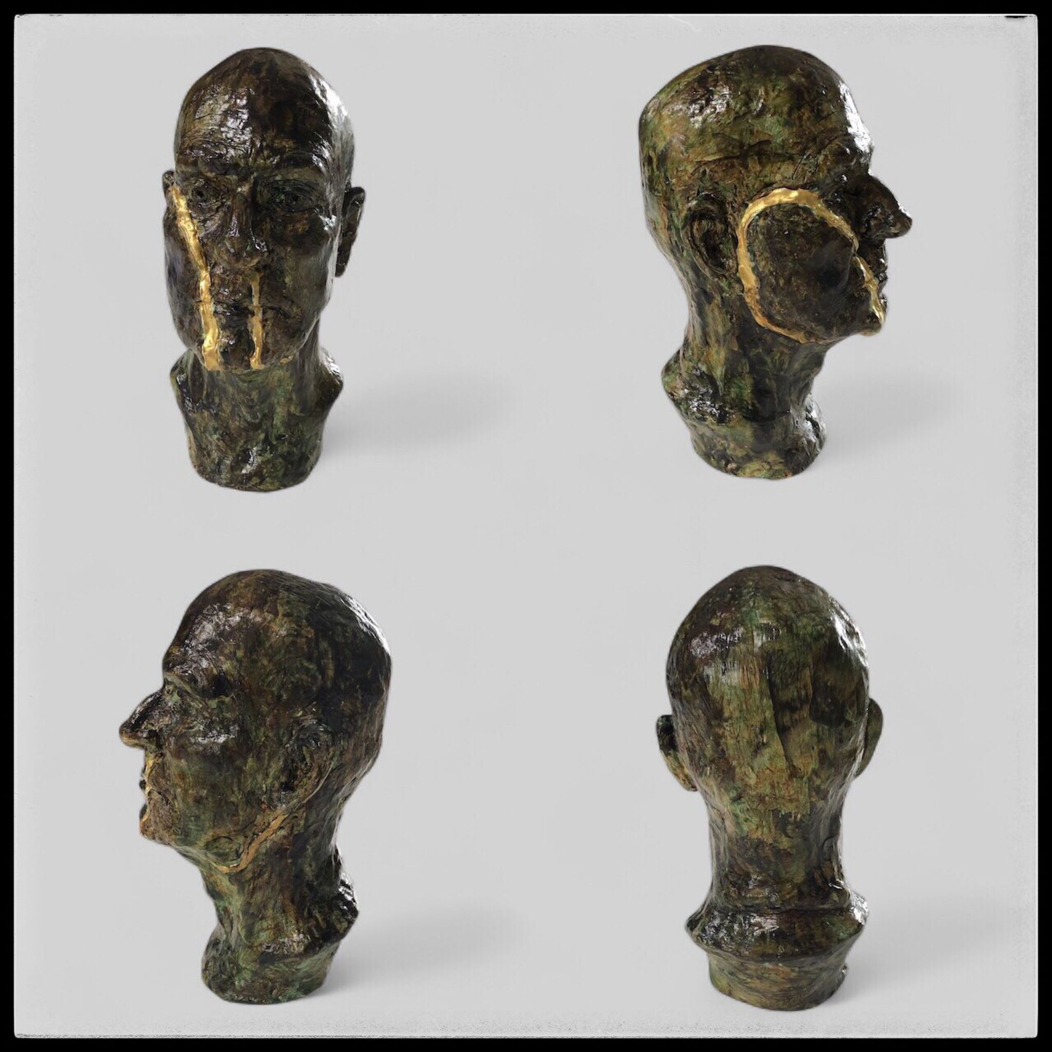 Kleiportret gebarsten tijdens het bakken, scheuren opgevuld met goudkleurige epoxyhars, gepatineerd