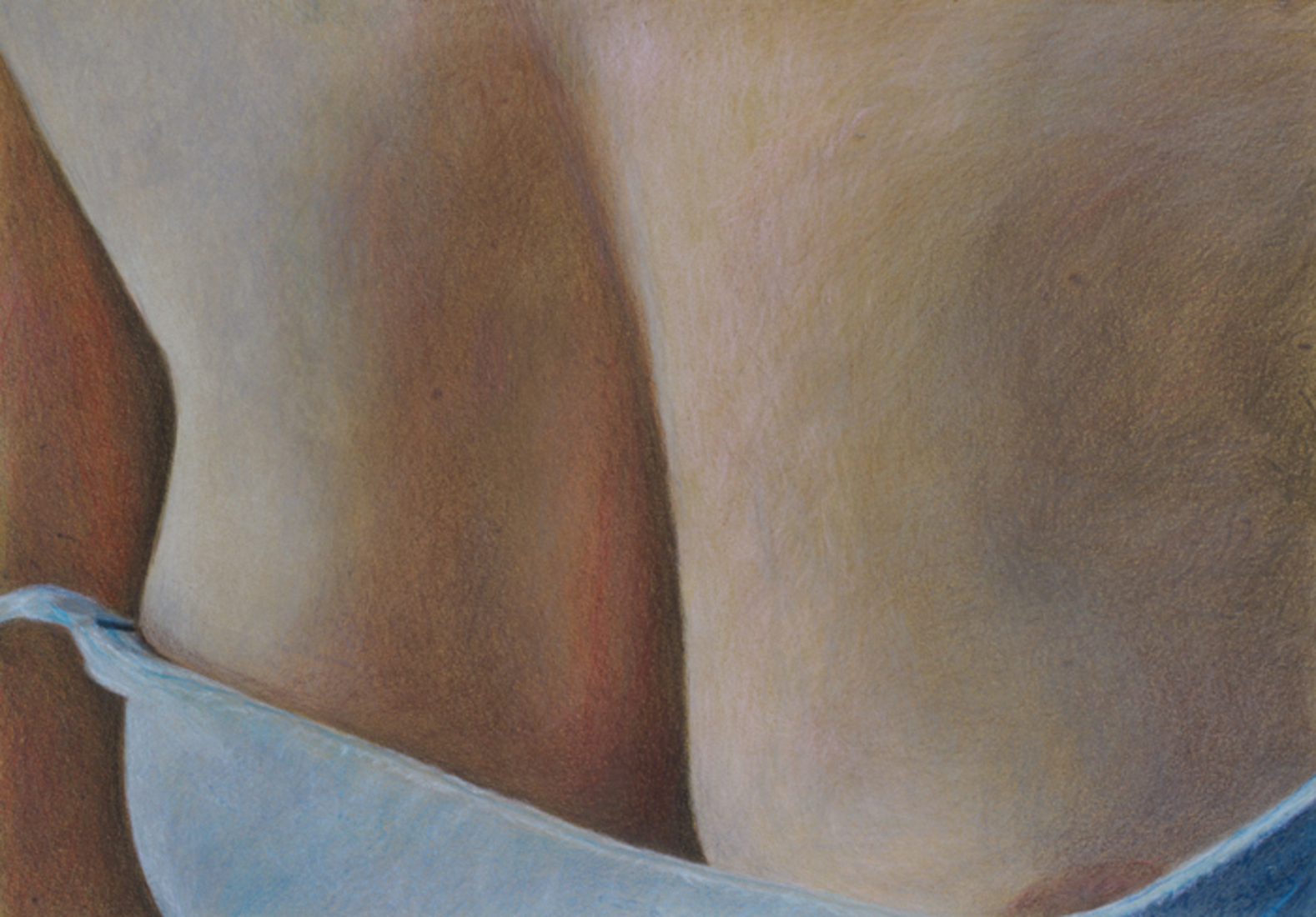 Een potloodtekening van een close-up van een vrouwenlichaam. In mijn schilderijen hou ik van het opzoeken van de grens tussen realisme en abstractie. Je ziet wel wat er afgebeeld is, maar op zo'n manier dat het beeld een abstract karakter krijgt. Met dit werk heb ik dat ook met tekenpotloden willen opzoeken. Door licht en schaduw met alle kleurnuances in elkaar over te laten lopen en door een ongebruikelijke compositie worden de vrouwelijke vormen ook vlakken, lijnen en ritme. Van dichtbij is het karakter van de potloodtekening goed te onderscheiden tegen de structuur van het gebruikte tekenpapier. Maar van verder weg smelten de streken samen, met een zachte uitstraling die past bij het sensuele onderwerp. Originele werken vind je op de Qeimoy website. De meeste werken zijn ook als print beschikbaar.