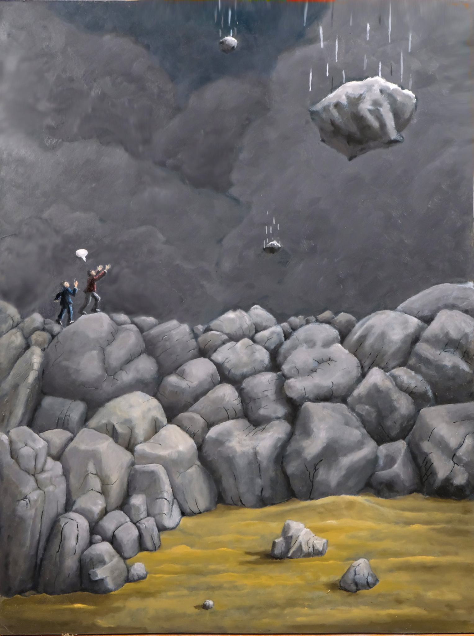 Twee heren die in een landchap een meteorietenregen aanschouwen, waar al de nodige meteorieten het aardoppervlak hebben bereikt.