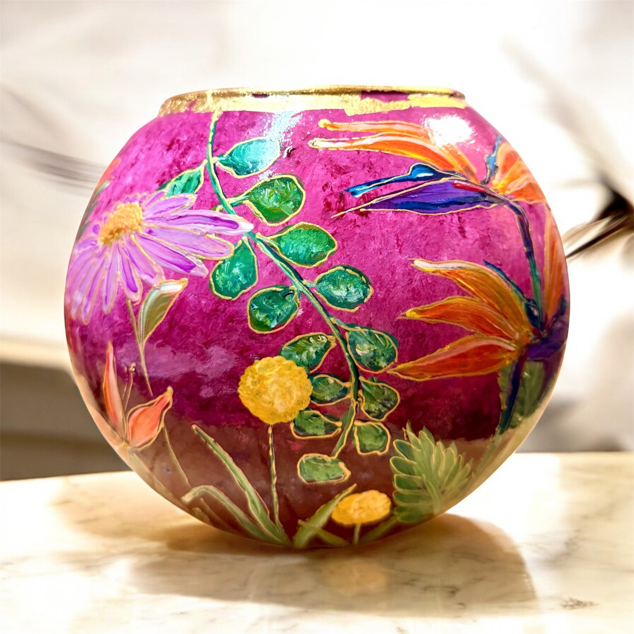 Mijn naam is Ariane Koch. Woon en werk in Tiel. Ik maak handbeschilderde vazen. De vazen staan vol met kleurrijke bloemen, vlinders en of vogels. Elke vaas is een bijzonder designobject.