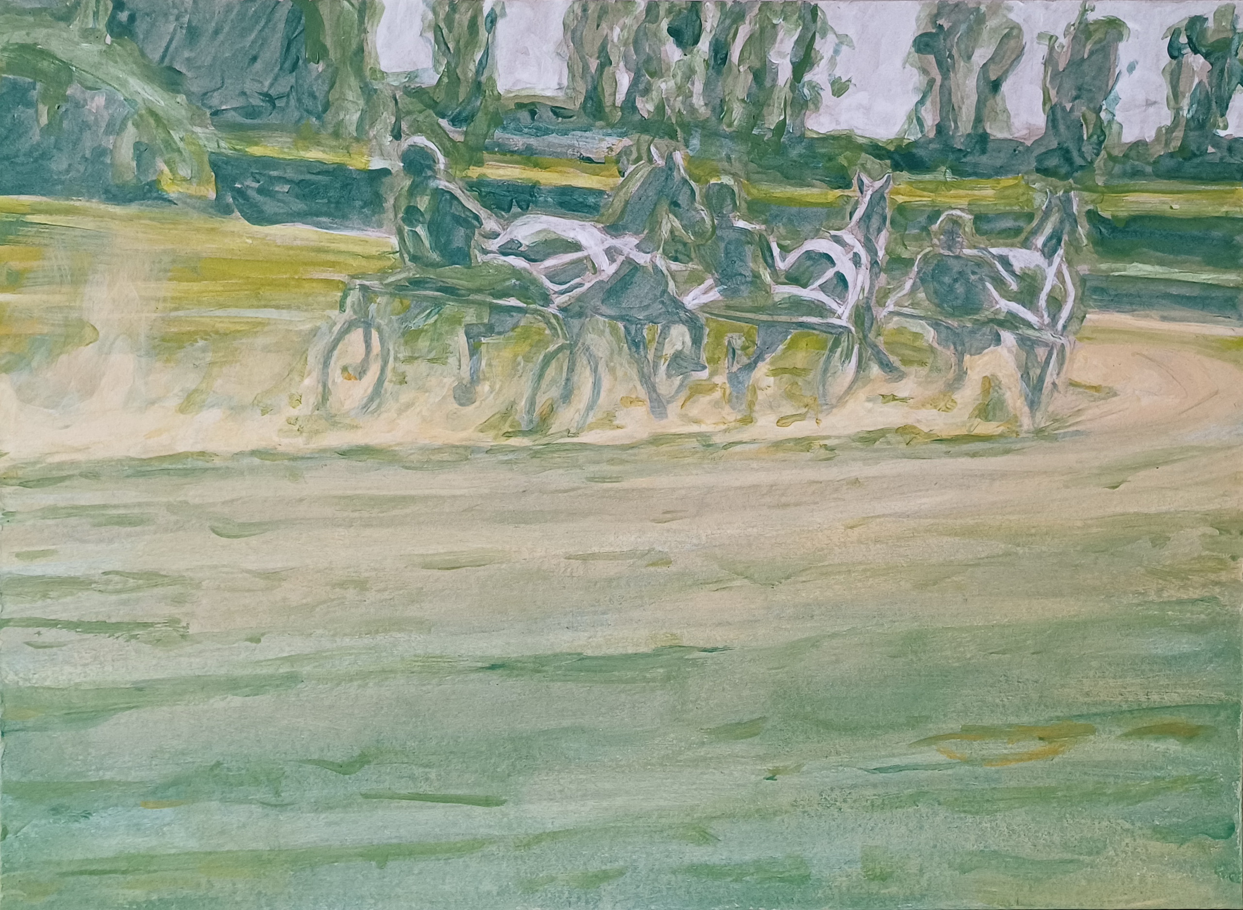 Kleine charmante werken op paneeltjes vaak A4-formaat. Portretten, bloemen, stillevens van fruit, glaasjes, doorkijken in het bos, een zicht met wachtende figuren….