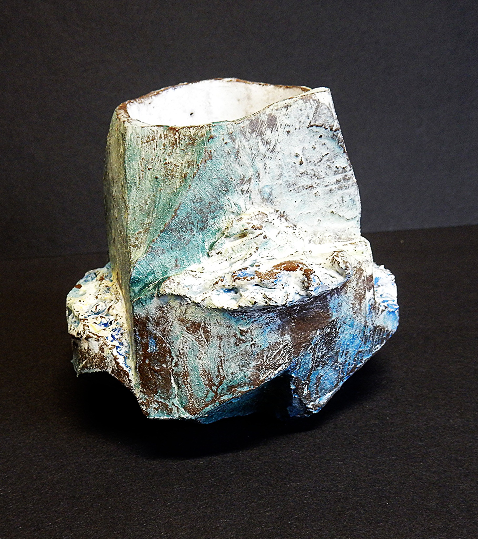 Dit hele kleine vaasje is gemaakt in de Kurinuki techniek, waarna het met engobes en glazuur bewerkt is.
