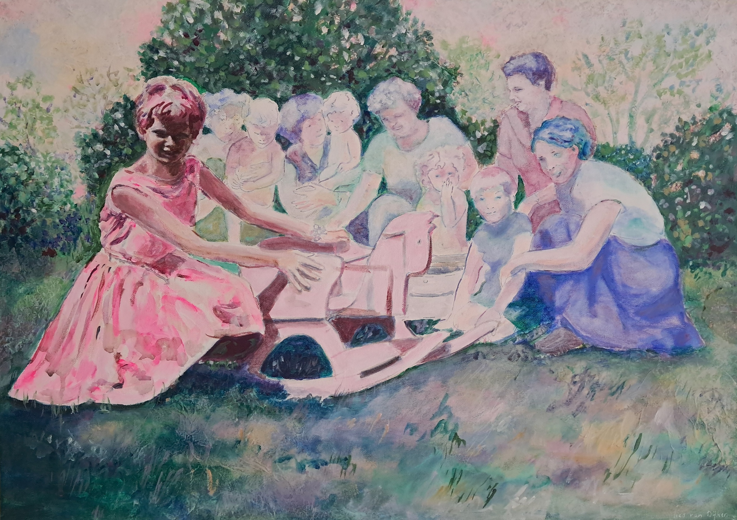 Inspiratie haal ik uit het thema herinneringen, verleden en verhalen. Familiefoto's spelen bijv. een rol in mijn werk. Ook kijk daarom naar schildertechnieken van andere schilders.