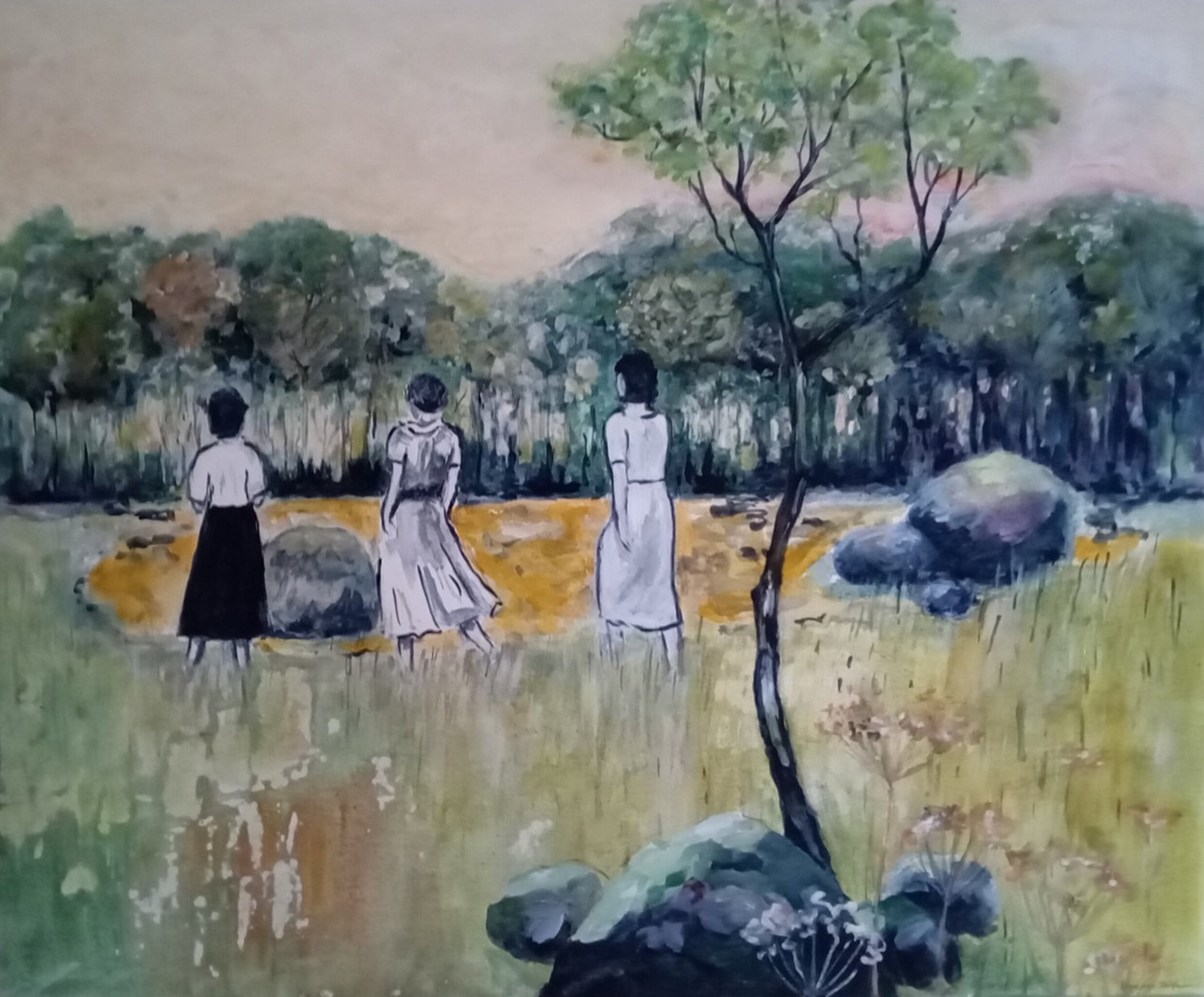 Vrouwen in een landschap. N.a.v. een vervreemdende familiefoto. Techniek geïnspireerd door werk van Mamma Andersson.