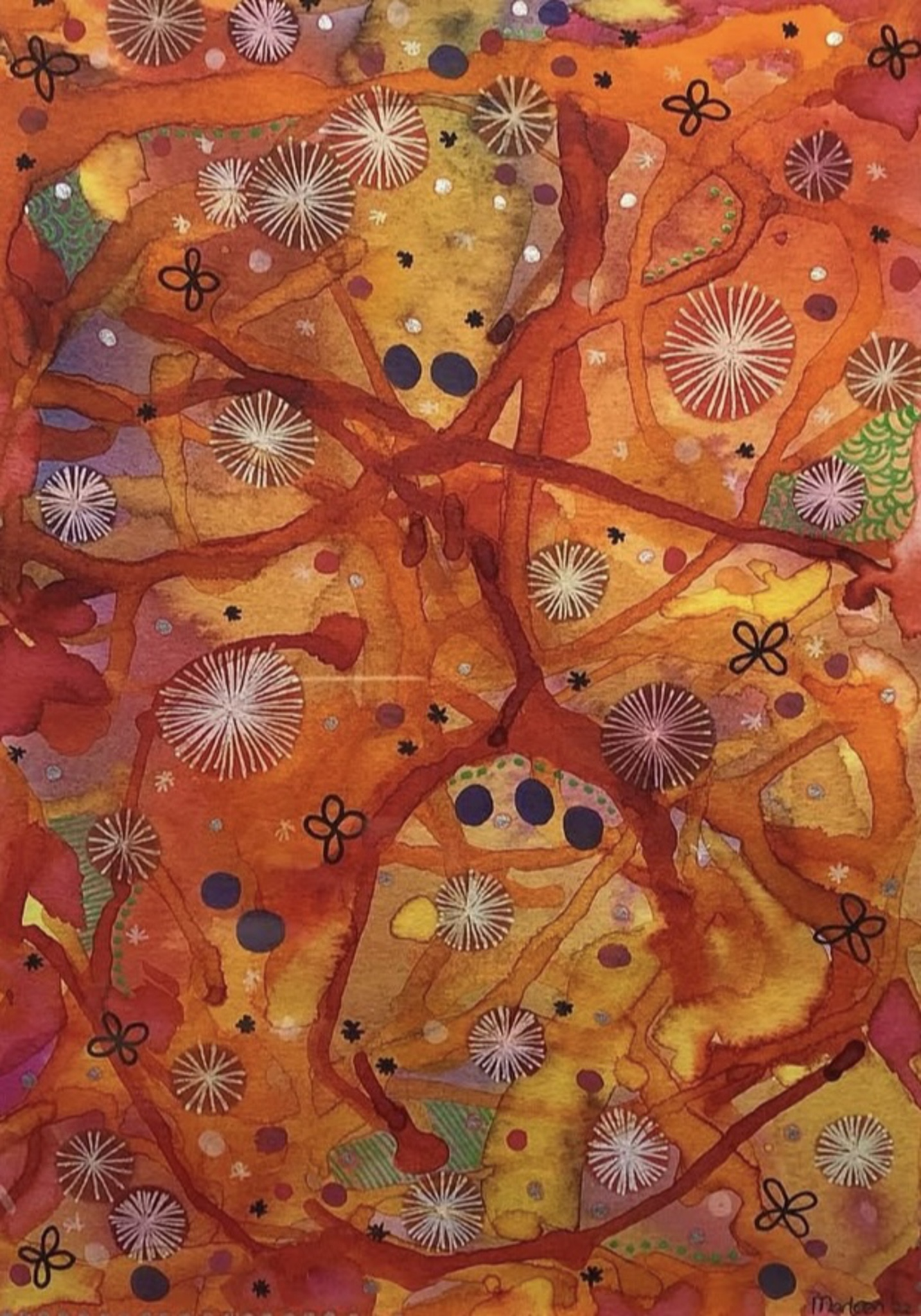 Dit werk ontstond op een avond waarop de kunstenaar een vol hoofd had. Ze koos intuïtief materialen uit en begon zonder vooropgezet plan te werken. Het proces stond volledig in het teken van loslaten. Een manier om gedachten te ordenen en ruimte te creëren. Het resultaat is een beeld dat de beweging van het moment draagt - visuele weerslag van het leegmaken van het hoofd.
