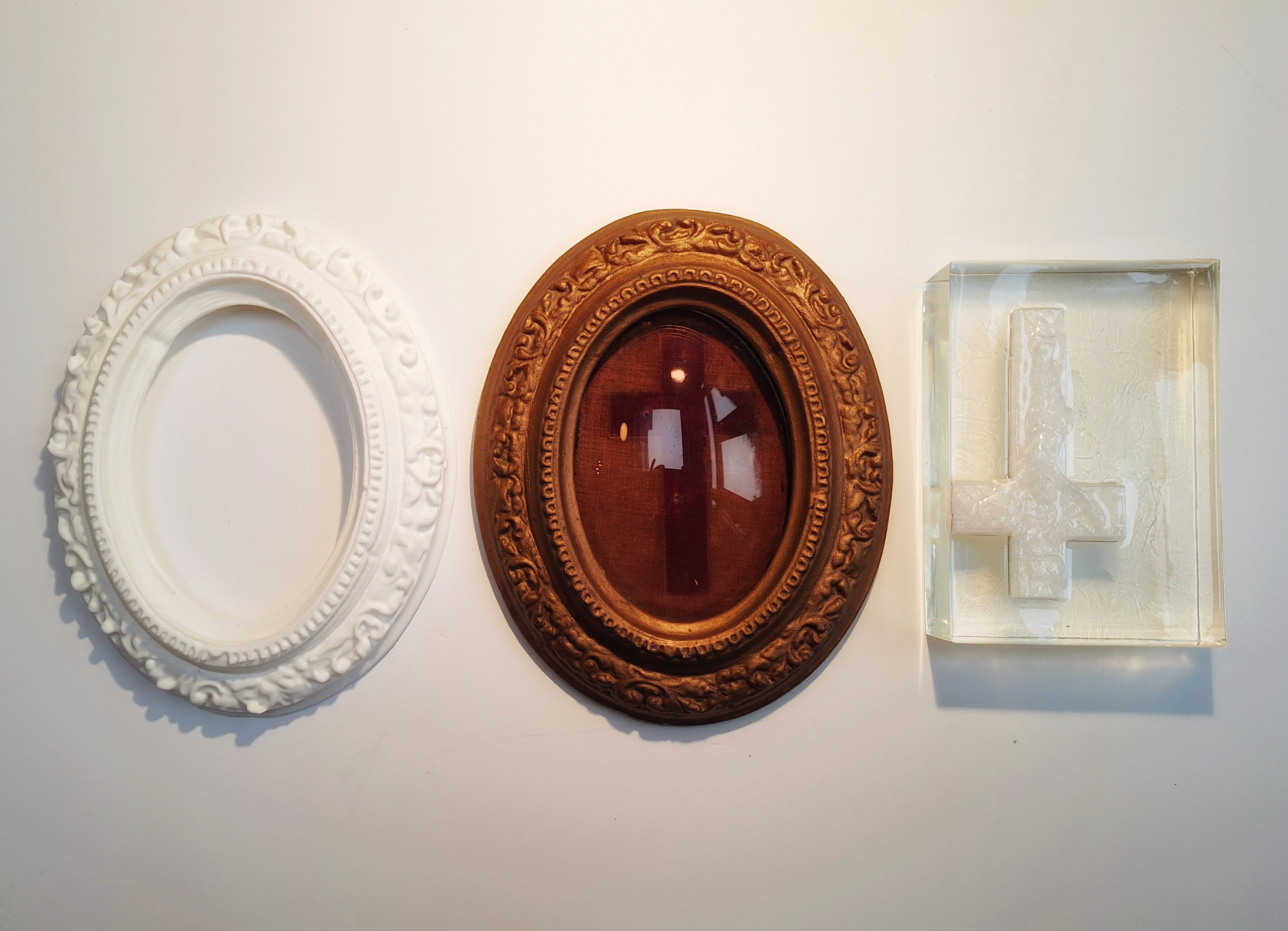 Theologia Negativa is a tripartite installation that stages absence not as lack, but as a structured condition of meaning. The work draws on the tradition of apophatic theology, in which the divine can only be approached through negation, while simultaneously engaging contemporary theories of simulacra, trace, causal inference and reproduction. The installation consists of three elements arranged horizontally. On the left, a 3D-printed white replica of a devotional frame appears entirely empty. It is a copy without an origin, a form awaiting meaning that never arrives. In the center, the original frame from which a crucifix has been removed still bears the visible imprint of what once occupied it. The object testifies to a prior presence that can no longer be accessed. On the right, a translucent resin block contains a 3D-printed copy of the removed crucifix, suspended and slightly offset. The cross survives only as an object severed from its function and context. Meaning does not return through replication, preservation, or trace. Instead, it disperses across copies, residues, and absences. By separating the sign, its imprint, and its reproduction, Theologia Negativa exposes how contemporary belief systems persist not through faith, but through repetition and inference.
