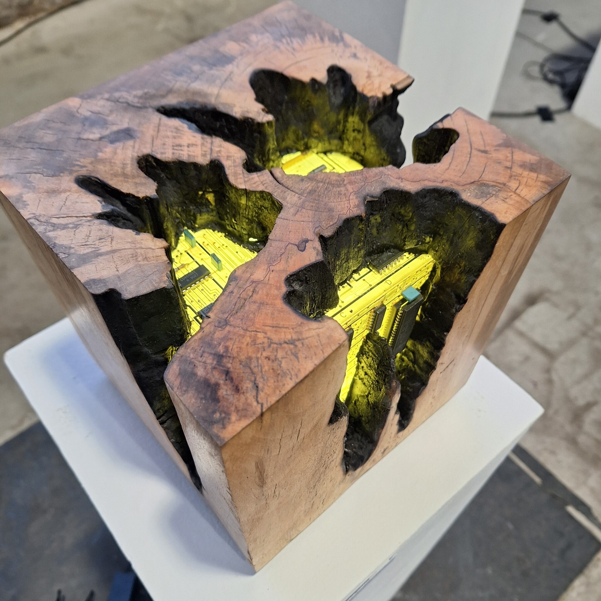 Art Licht Kringloop Hedendaagse Kunst Peter Kubus Cube Berk Wood Led Recycle Birch Waste Printplaten Schudde Ewaste Upcycle Upcycling Circuitboards