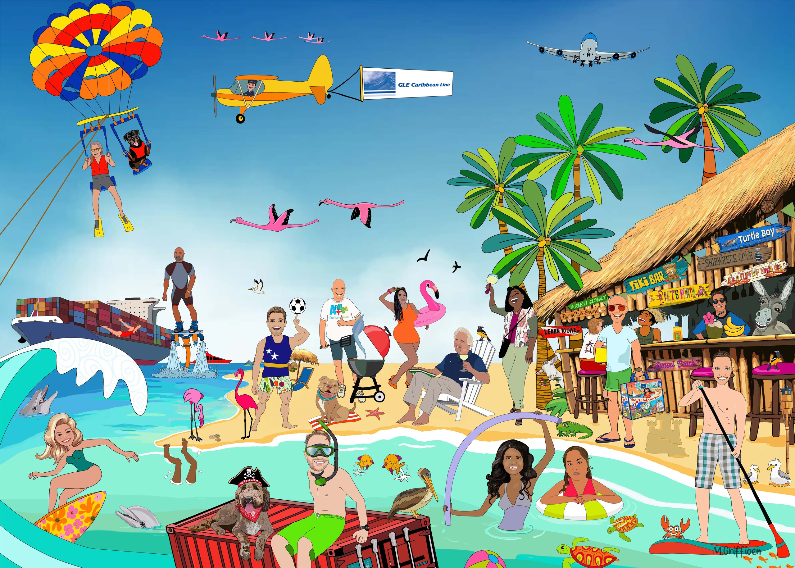 Voor het 50 jarig jubileum van GLE Caribbean, het bekende containertransport bedrijf tussen alle Nederlandse eilanden in het Caribisch gebied heb ik een mooie afbeelding gemaakt met al hun personeel (herkenbaar maar toch met een knipoog) Het leuke is dat deze afbeelding gebruikt kan worden op kalenders, tassen en ook op puzzels dus super uniek en leuk om kado te geven, mooie reclame. Mocht je naar zoiets persoonlijks opzoek zijn? Jullie weten me nu te vinden.
