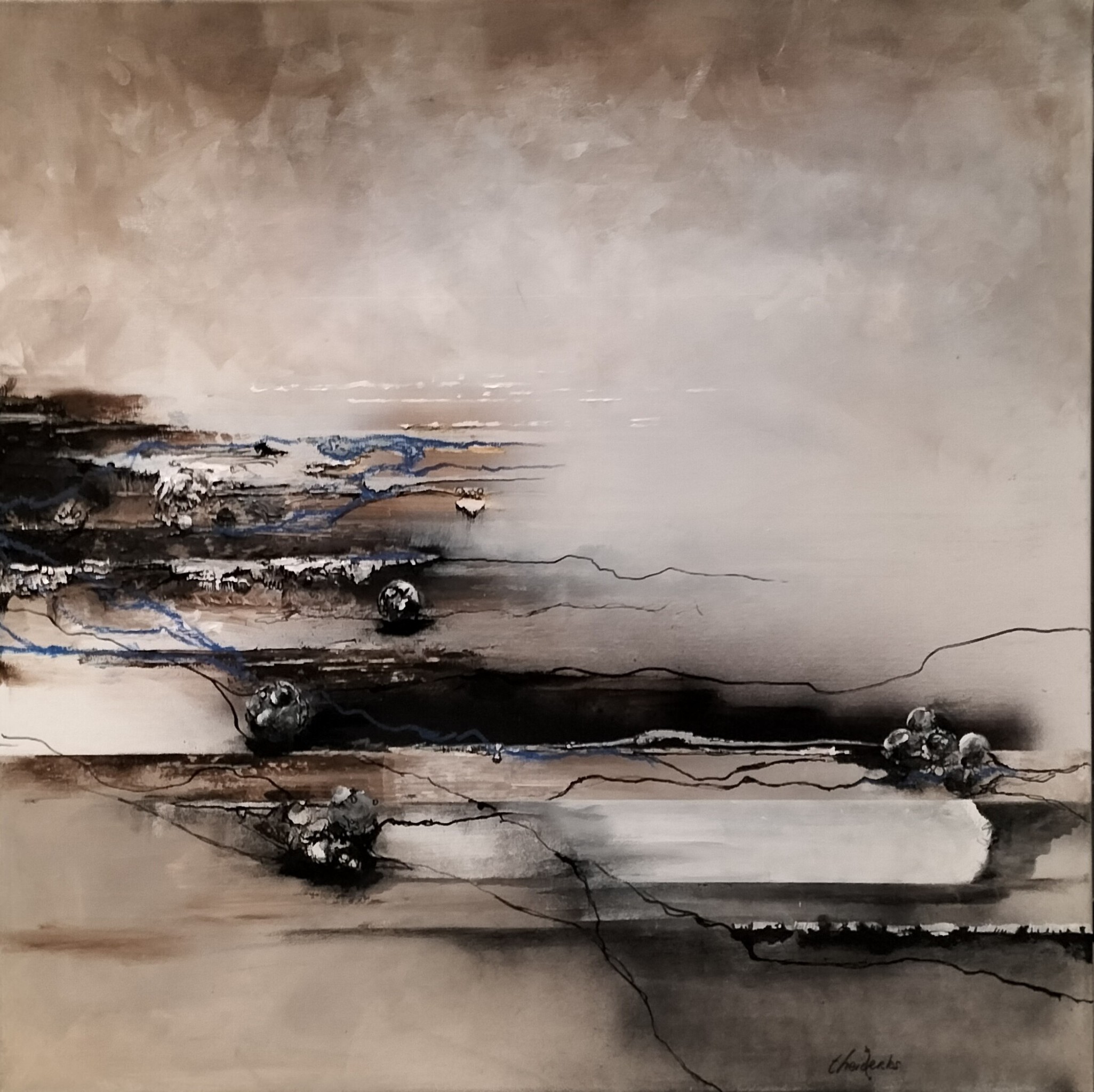 Mixed Media op doek met als basis acryl. 80 x 80 x 2 cm exclusief stalen lijst