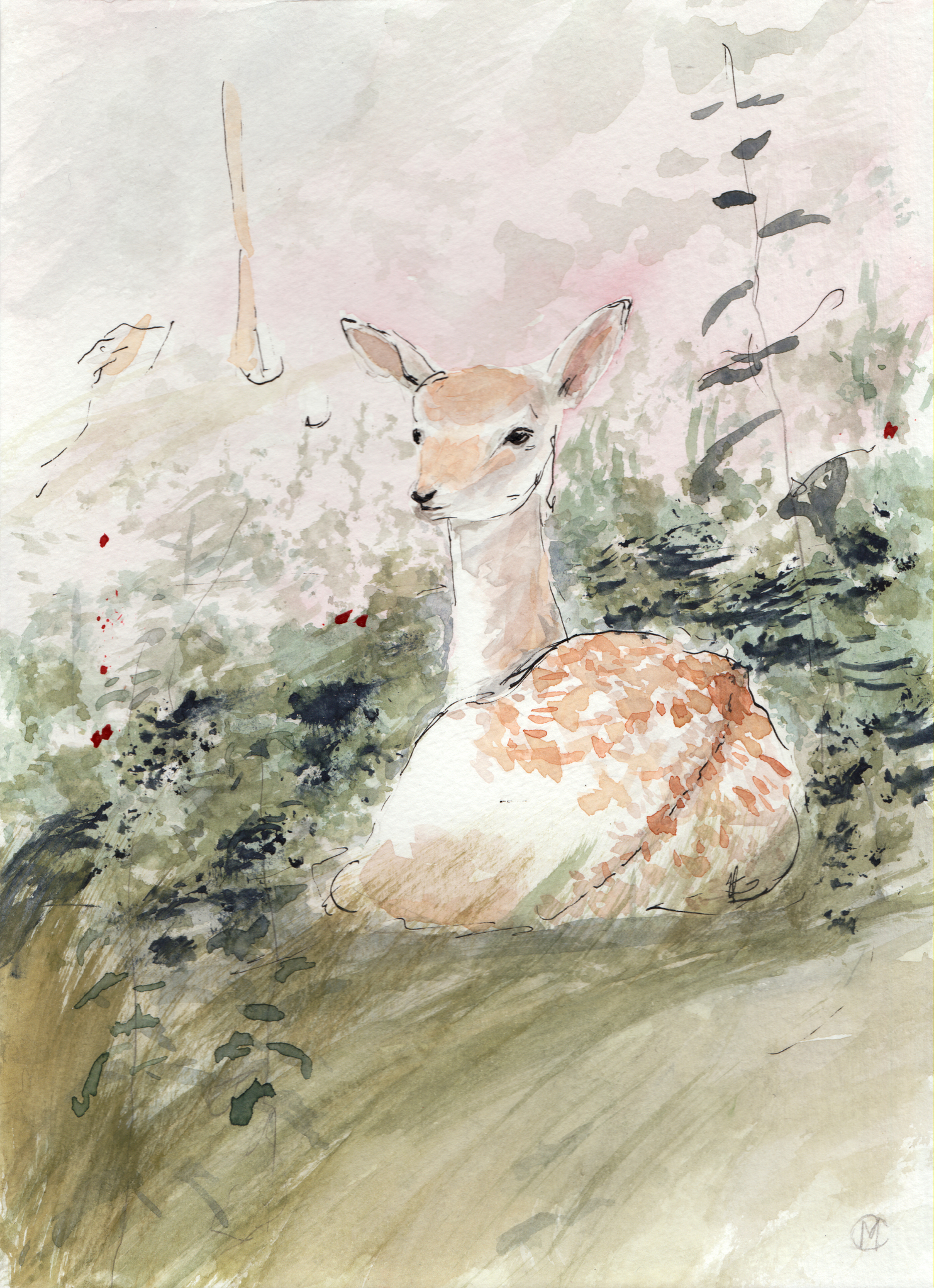 Jong hertje in de schaduw van het bos. Aquarel en pentekening met O.I. inkt Formaat 18 x 24 cm in passepartout van 28x35 cm.
