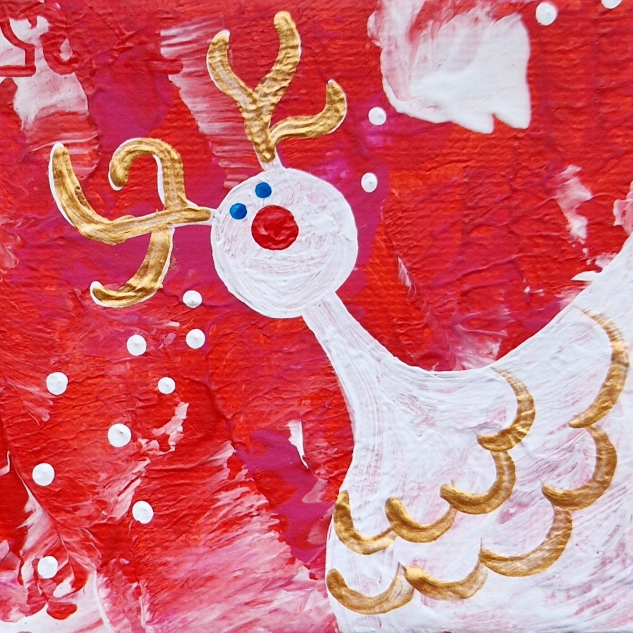 Decembercadeautje, verras jezelf of iemand anders met dit minischilderijtje, 7 bij 7 cm. Acrylverf op katoen, met een ophanghaakje aan de achterkant. November/december 2025; de prijs is inclusief decemberverpakking (rode achtergrond, met gouden sterretjes erop) en verzendkosten binnen Nederland (via Postnl).