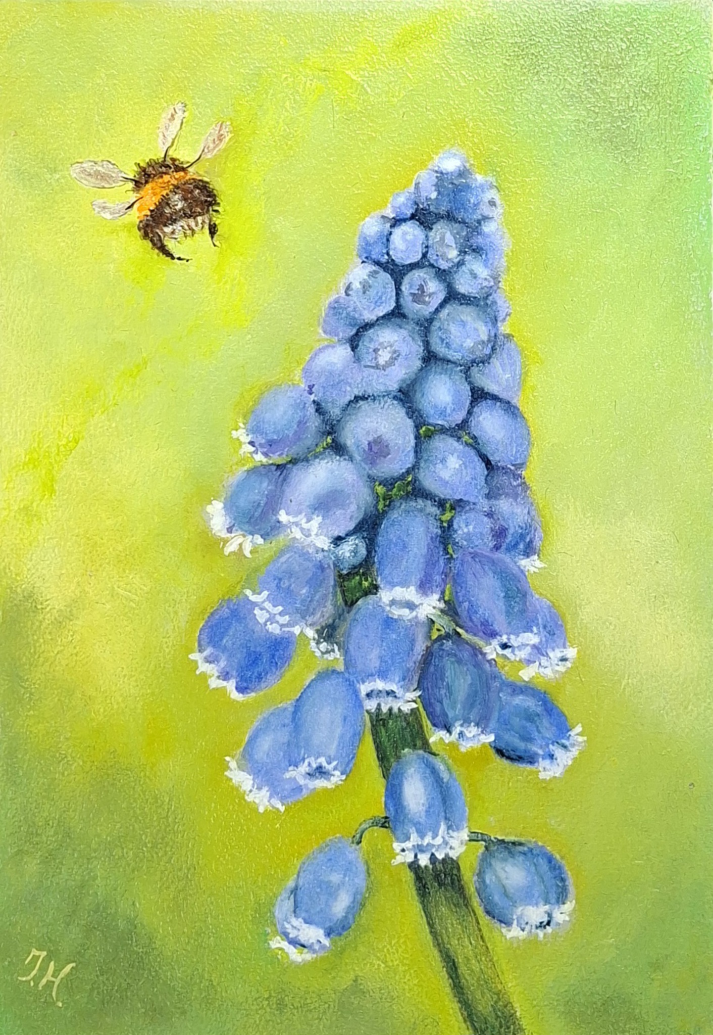 Blauwe druifjes met bij. Dit schilderijtje is te koop in de kunstwinkel van "de Kunstkerk Dijk en Waard" in Sint-Pancras.