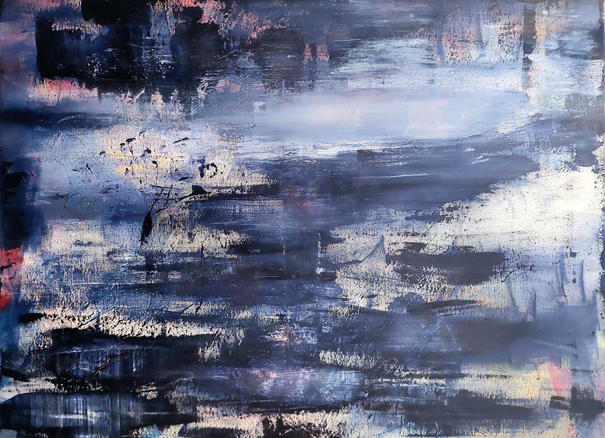 Indigo overheerst op dit doek naast de witte passages en hier en daar wat kleur door de onderschildering. Zowel in de breedte als in de lengte aan de muur is het een mysterieus schilderij.