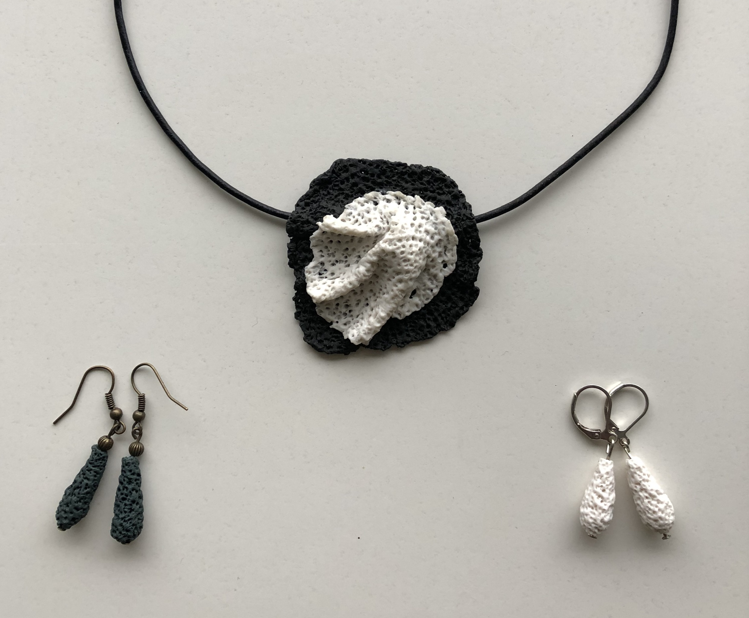 Mijn sieraden zijn handgemaakt van porseleinklei, al dan niet ingekleurd met stains. Ze zijn gestookt op 1220 graden C. Die hoge temperatuur maakt ze stevig en sterk. Ieder stuk is uniek en een klein object op zich. Mijn sieraden zijn comfortabel om te dragen en voelen aangenaam aan.