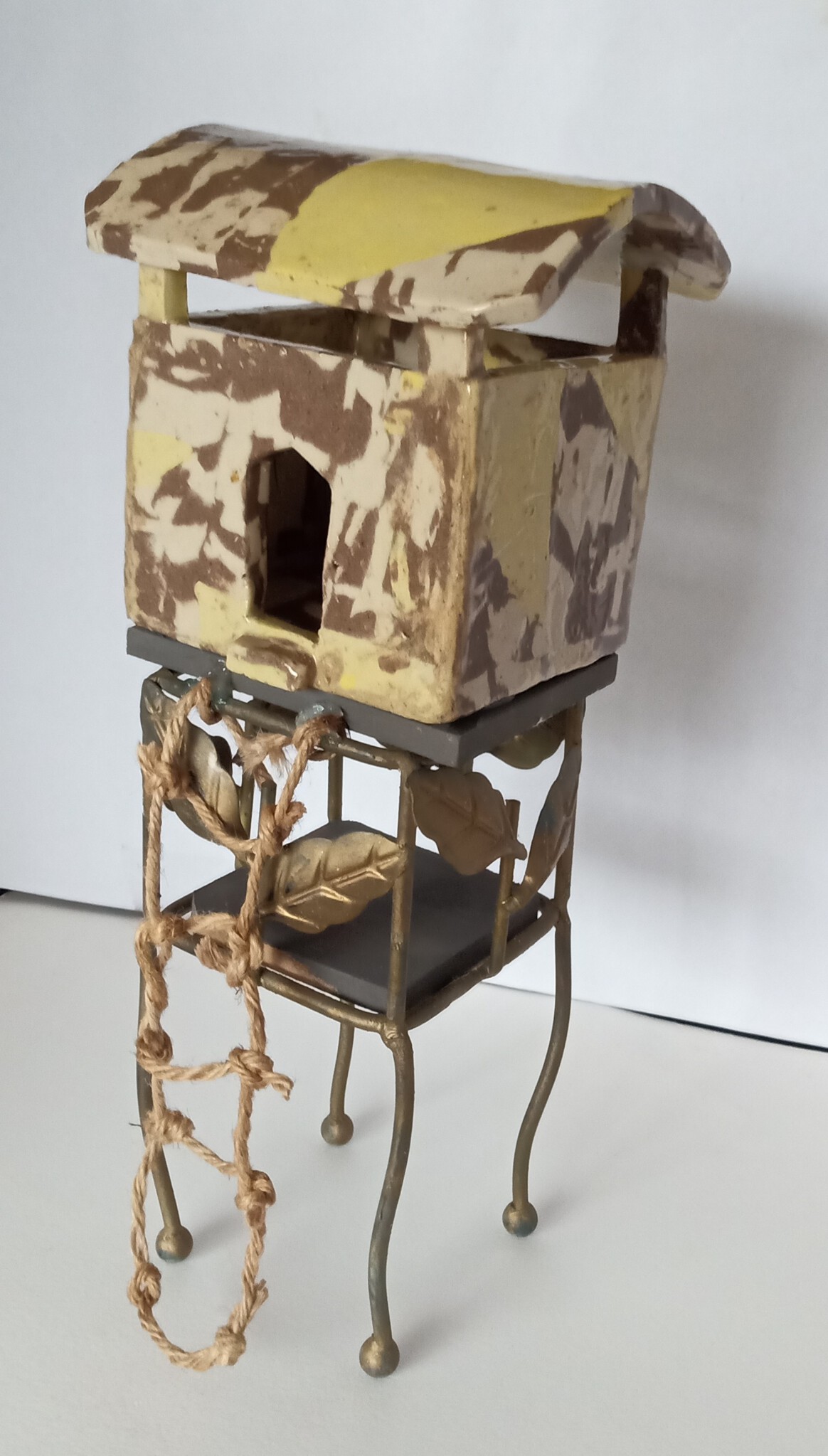 bos huisje ,gemaakt van meer kleuren klei, Nericomi ijzeren onderstel en touwladder