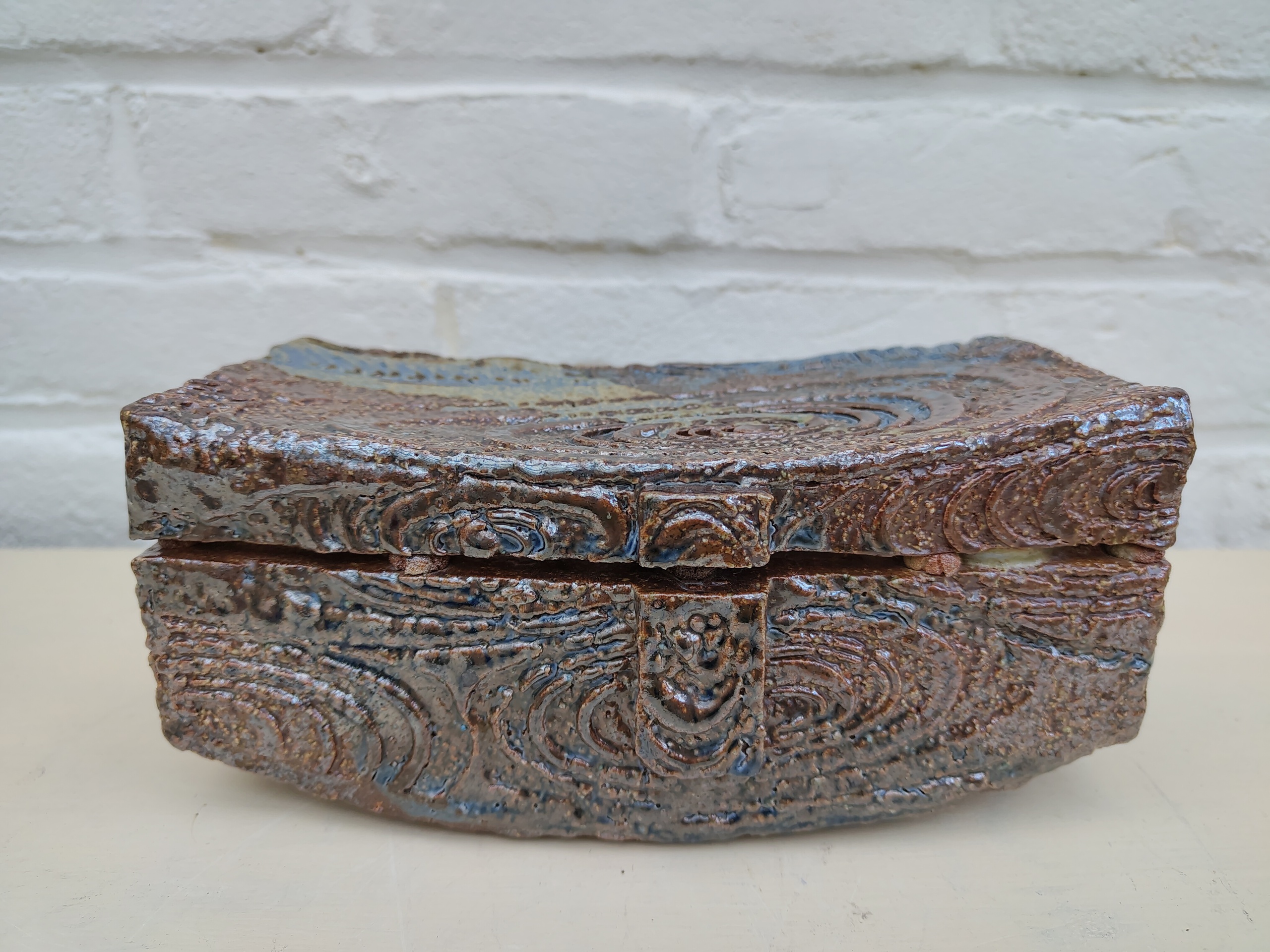 Opgebouwd vanuit kleiplaten met textuur. Steengoed. Zoutstook in reductie.