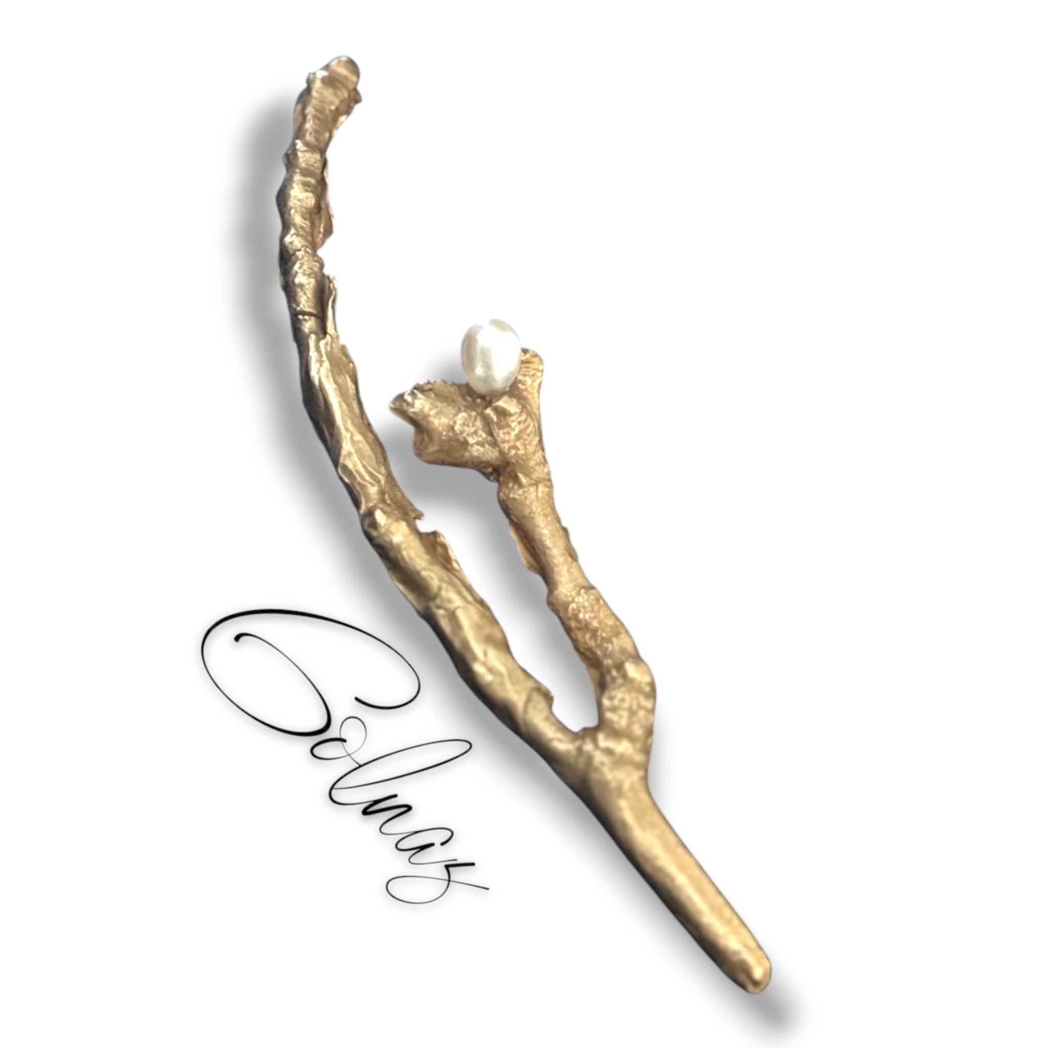 Bronzen broche in vorm van een takje. Met een zoetwaterparel.