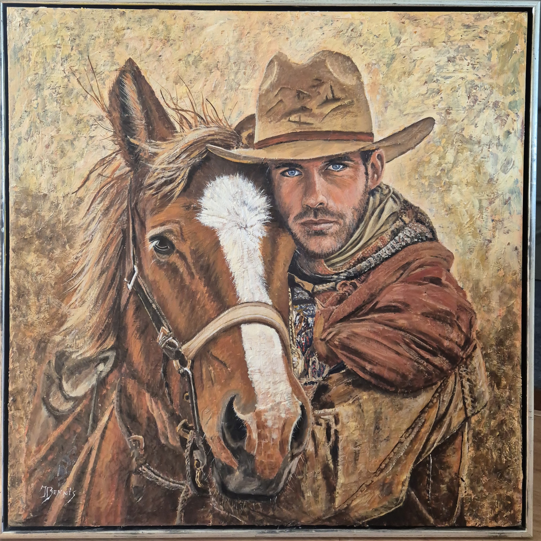Horse and Cowboy, Acryl op doek met baklijst. Met behulp van paletmes en dikke streken verf vervaardigt in warme aardse kleuren.