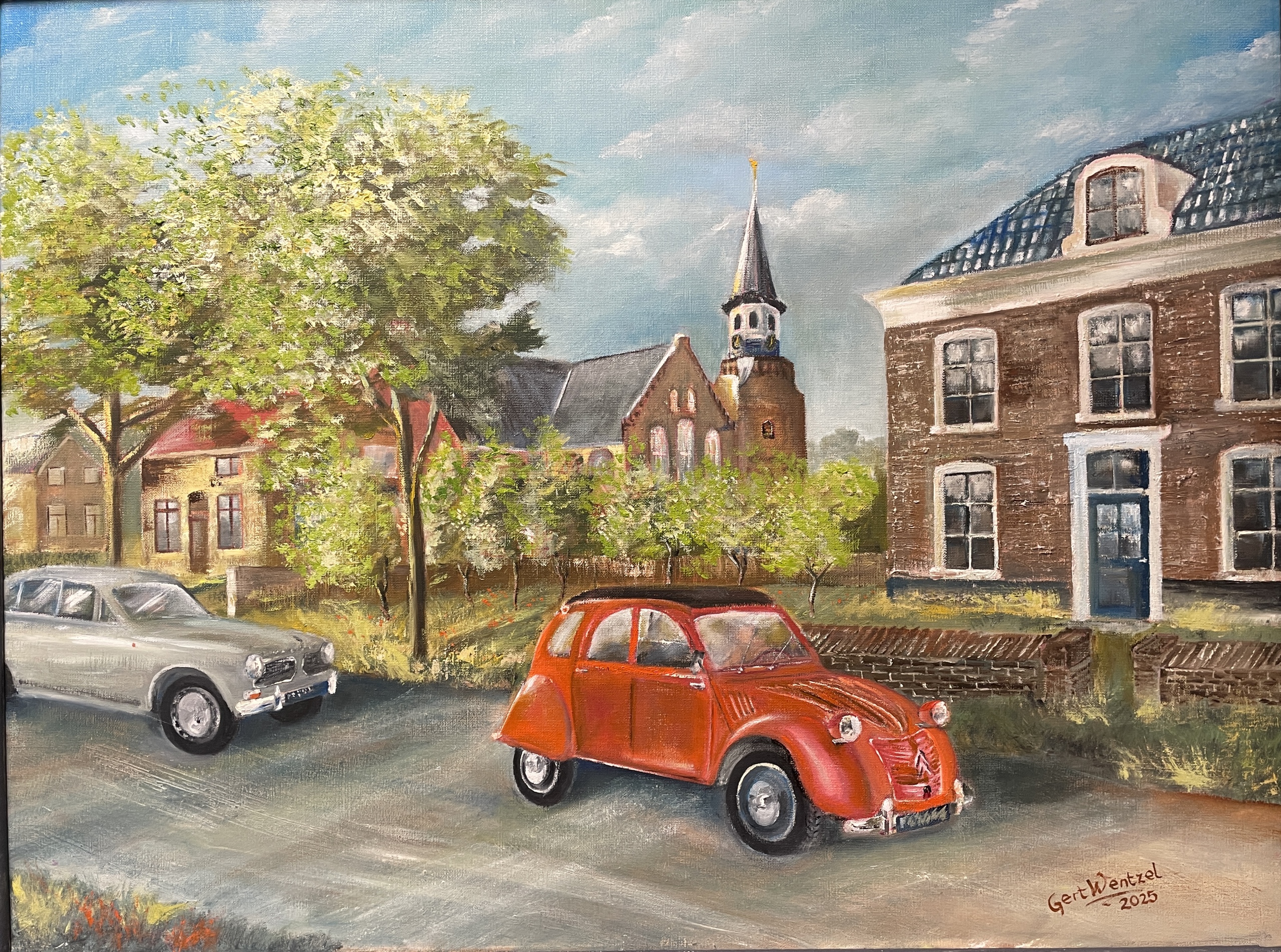 Voor de Winterlichte Etalages in Nunspeet heb ik dit schilderij gemaakt dat in december te zien zal zijn bij Karsen Woonwinkel. Dat is extra bijzonder, want juist deze plek vormt het onderwerp van het werk. Zoals vaker bij mijn straatgezichten is het geen exacte reconstructie van hoe het er ooit uitgezien heeft, maar een verbeelding op basis van oude foto’s, herinneringen en interpretatie. Het gaat om de essentie van die tijd, niet om de perfecte feitelijke weergave. Centraal staan de oude pastorie en de dorpskerk, gebouwen die het hart van Nunspeet al generaties lang markeren. Op het erf van de pastorie stonden vroeger fruitboompjes en er liep een muur omheen. Een deel van die muur bestaat nog steeds – wie langs het trouwlaantje wandelt, herkent hem misschien. Links in het schilderij een gebouw op de plek waar nu de woonwinkel van Karsen gevestigd is. Wanneer dat precies is gebouwd, weet ik niet; vermoedelijk in de jaren ’50. Maar in het schilderij heb ik geprobeerd de sfeer van die tijd zo goed mogelijk te vangen. Zoals vaak speelt ook het straatbeeld een grote rol. Helemaal vooraan staat een Citroën 2CV AZL3, een model dat in België werd geproduceerd voor de Belgische en Nederlandse markt. Dit type is te herkennen aan de derde zijruit. Daarachter rijdt een Volvo Amazone, niet zomaar gekozen maar met een persoonlijk verhaal: het was namelijk de auto die mijn vrouw Charlotte vroeger thuis had — een mooie manier om iets persoonlijks en herkenbaars aan het werk toe te voegen.