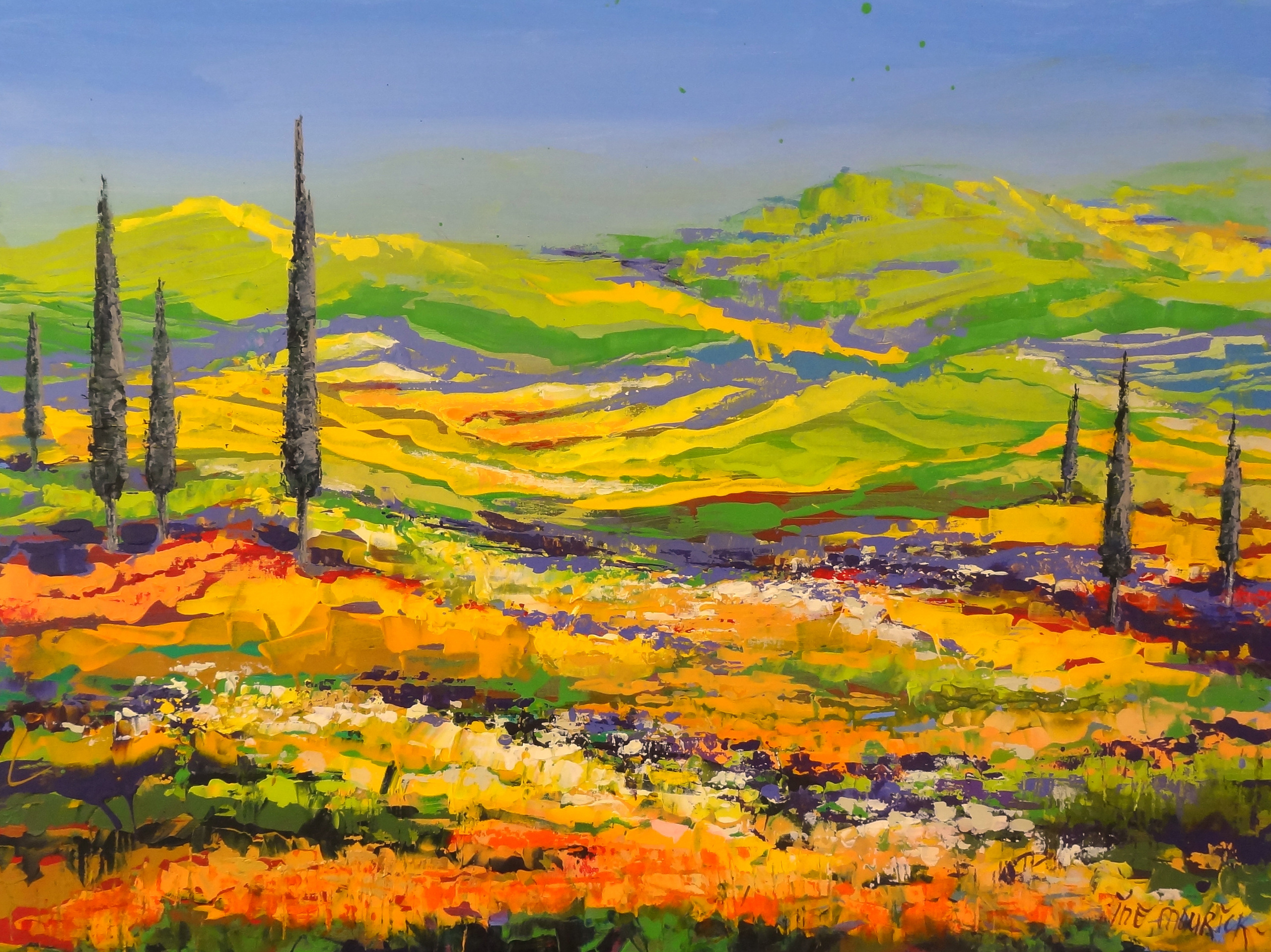 Geel Yellow Groen Green Zomer Summer Expressionism Expressionisme Cypresses Cipressen Semi-abstract Wilde-bloemen Wild-flowers Kleurrijk-landschap Colorful-landscape Summer-landscape Zomers-landschap Green-hills Groene-heuvels Framed-painting