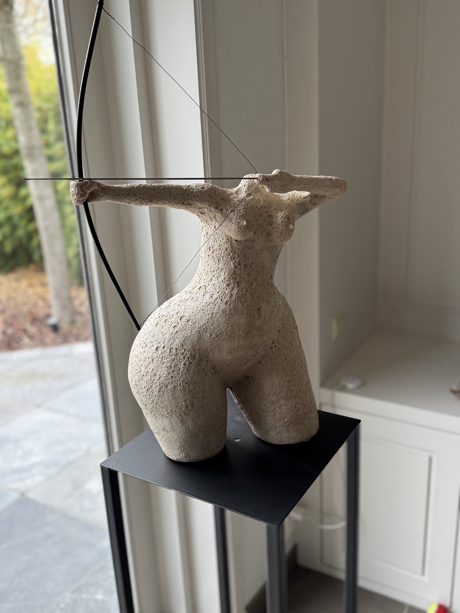 Een krachtig, torsvormig vrouwelijk lichaam spant de boog tot het uiterste, precies op het moment vóór het lossen van de pijl. De ruwe, poreuze huid van het materiaal benadrukt zowel de kwetsbaarheid als de onverzettelijke kracht van deze anonieme krijger. Door het ontbreken van hoofd en onderbenen verschuift alle aandacht naar de gespannen romp: een tijdloos symbool van focus, veerkracht en stille vastberadenheid