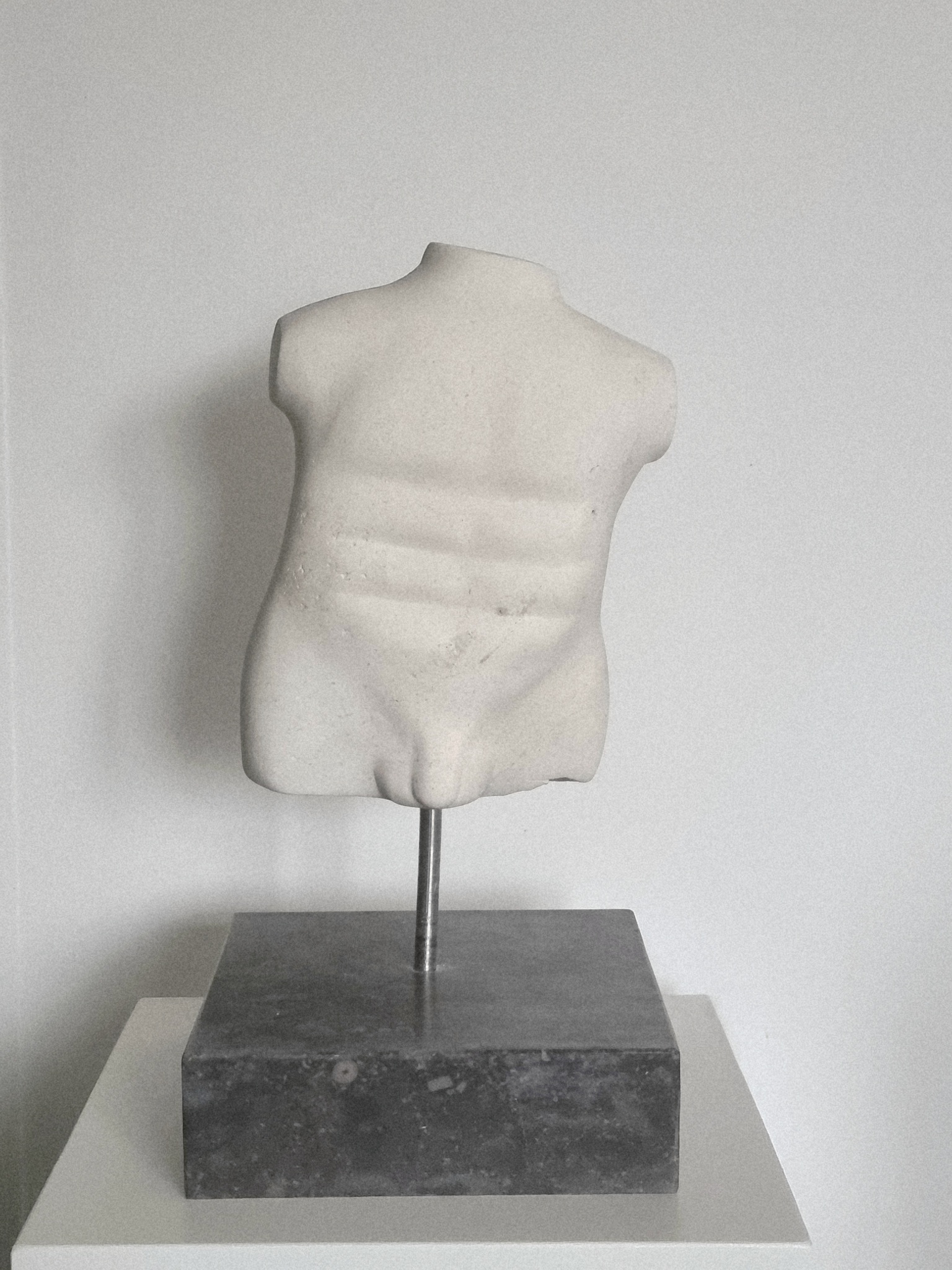 Torso Robuuste kalksteen op robuuste granieten sokkel. Douglas houten sokkel is ook mogelijk. Voor meer fotos zie mijn andere website www.carosbeelden.com Afmetingen torso 24x17x9 4,7 kg Totale hoogte bij douglas sokkel 48 cm