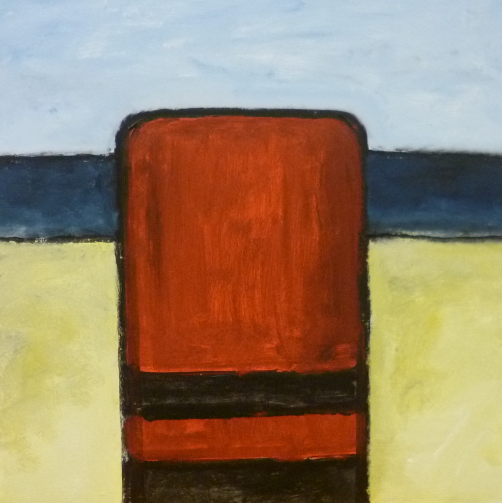 Karakteristieke strandpaal in rood, te vinden op het strand van Texel. 82 x 82 cm. VERKOCHT.