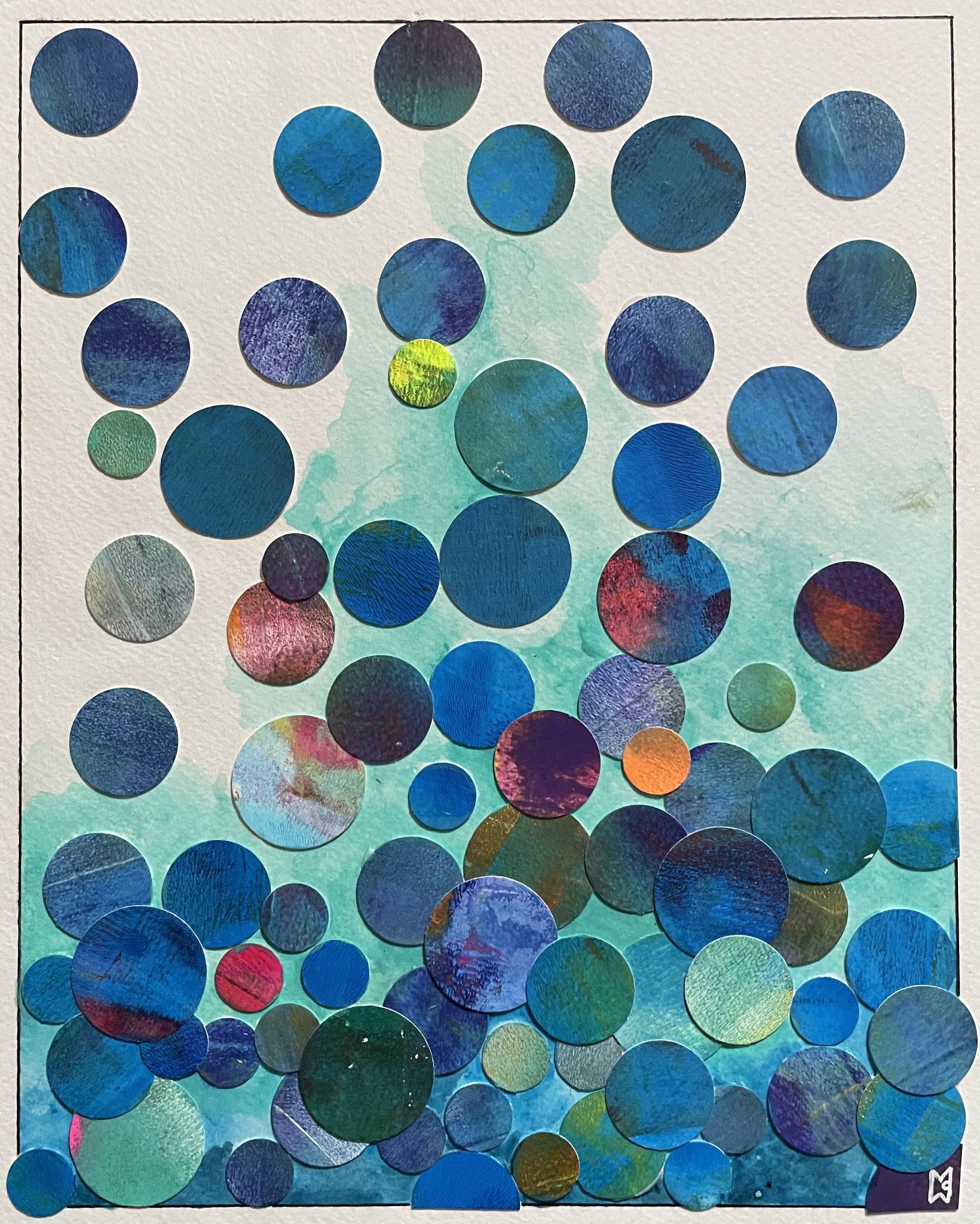 Blauwe cirkels bevinden zich vrij in het vlak. Ze zijn speels en ongedwongen geplaatst, waardoor een levendige en ritmische compositie ontstaat.